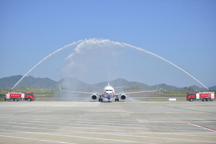 2025年9月28日,由中国国际航空执飞的北京大兴至瑞金航班飞抵瑞金机场后通过“水门”。新华社发(杨鑫摄)