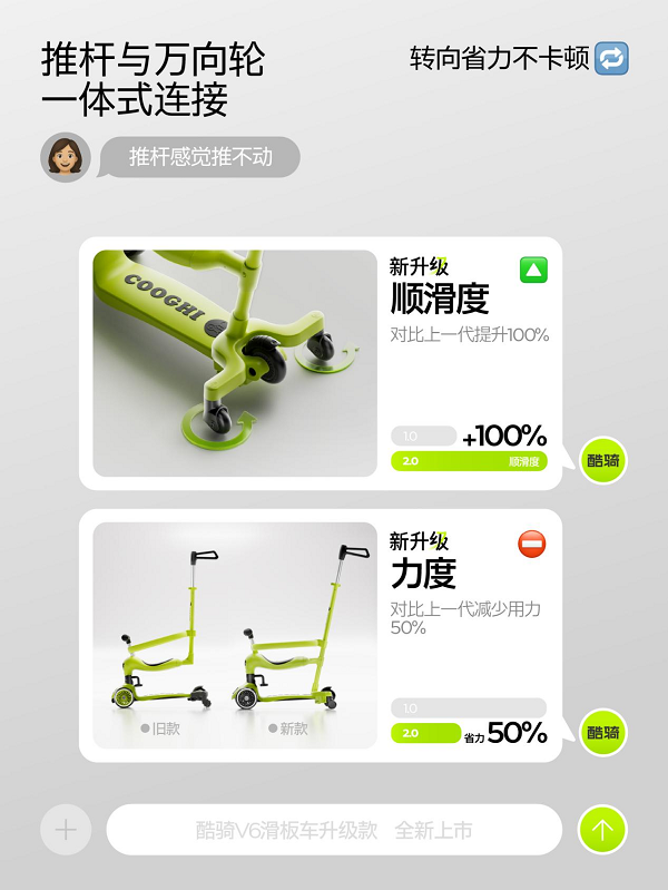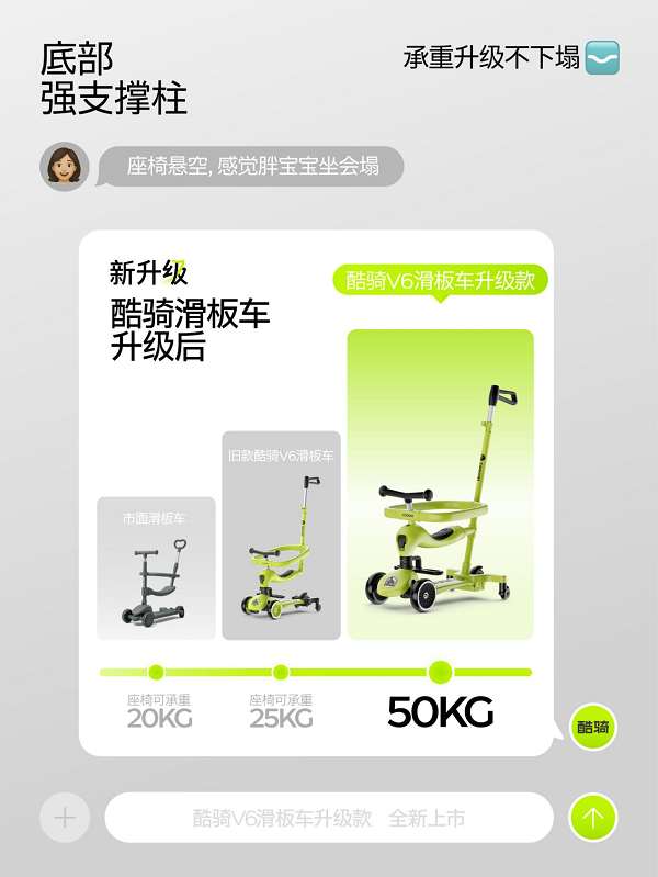“万向轮太灵,不会推?”“座椅悬空,胖宝宝坐着不安全?”“推杆转向费劲?”……在翻看了海量用户评价后,酷骑团队将这些疑惑一一转化为产品升级的方向。新一代V6滑板车围绕“稳固性、承重性与操控性”进行了三大核心升级: