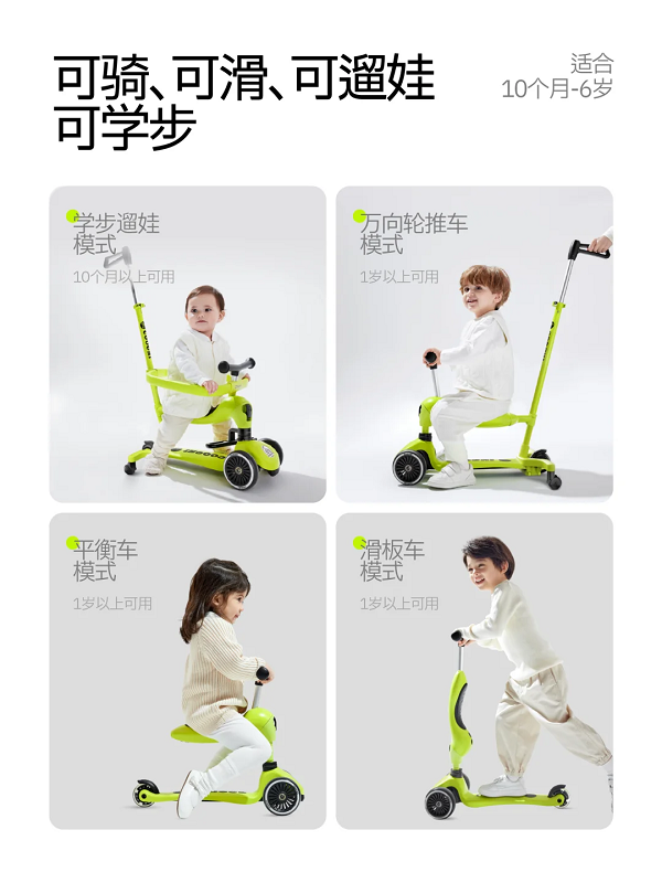 除了核心升级,酷骑依旧延续“一车多用”的设计理念。V6升级款支持从学步模式、遛娃模式、平衡车模式到滑板车模式的无缝切换,适配10个月至6岁宝宝的全阶段成长需求。独有的360°全包围护栏与可拆卸脚踏,为小月龄宝宝提供贴心守护。V3升级款则兼具遛娃、平衡车与滑板车功能,轻便车身搭配万向轮推行设计,让宝宝尽兴玩耍,家长轻松带回。