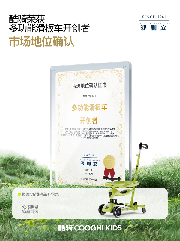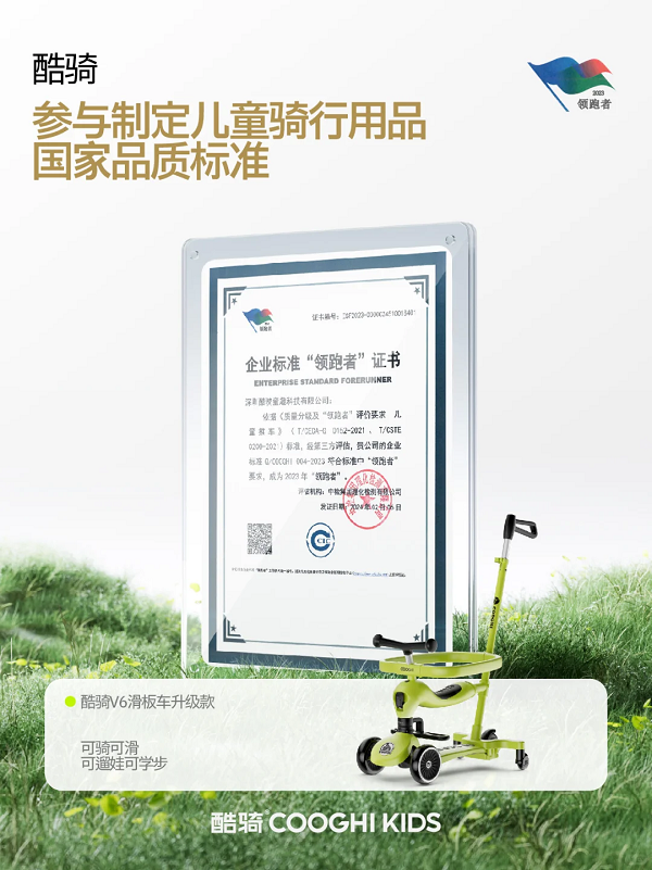 酷骑作为多功能滑板车品类的开创者,不仅获得沙利文国际权威机构认证,还参与制定了儿童骑行用品国家品质标准,获得中检集团认证的塑胶玩具领跑者荣誉称号。