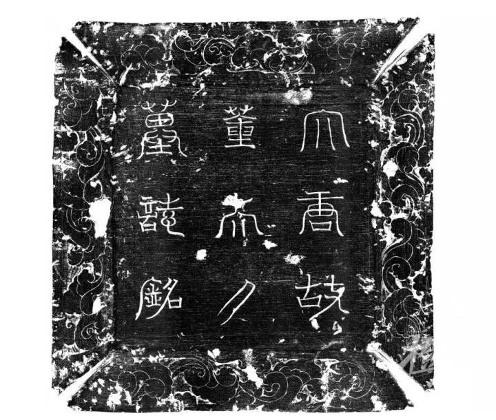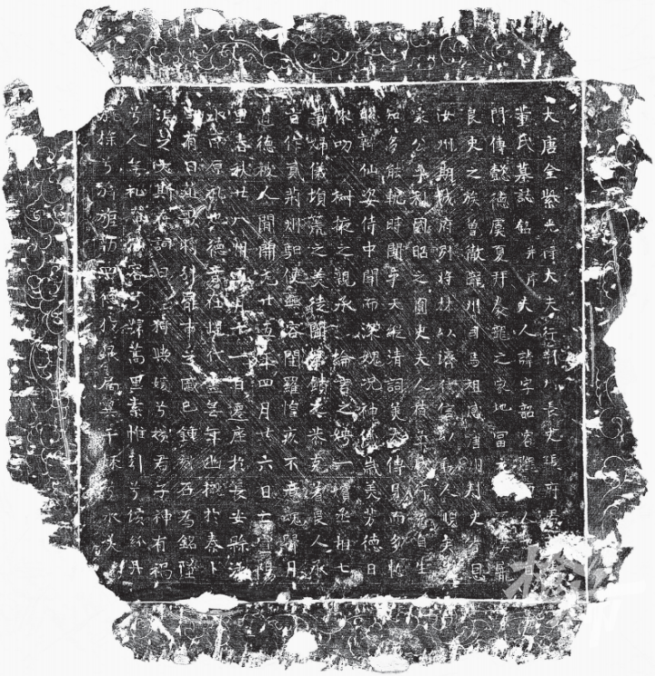墓志顶面阴刻着篆书,“大唐故董夫人墓志铭”。四侧雕刻着缠枝花卉蔓草纹,正书18行,满行18字,总共有320字。
