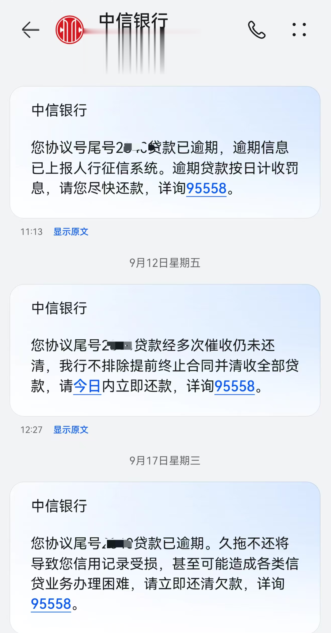 据河南青年时报·东风新闻披露的信息,郭先生在九月份频繁接到中信银行的催收短信和电话。催收短信截图显示,9月8日、12日和17日,中信银行三次对其发送催收短信,催收缘由即是贷款逾期。