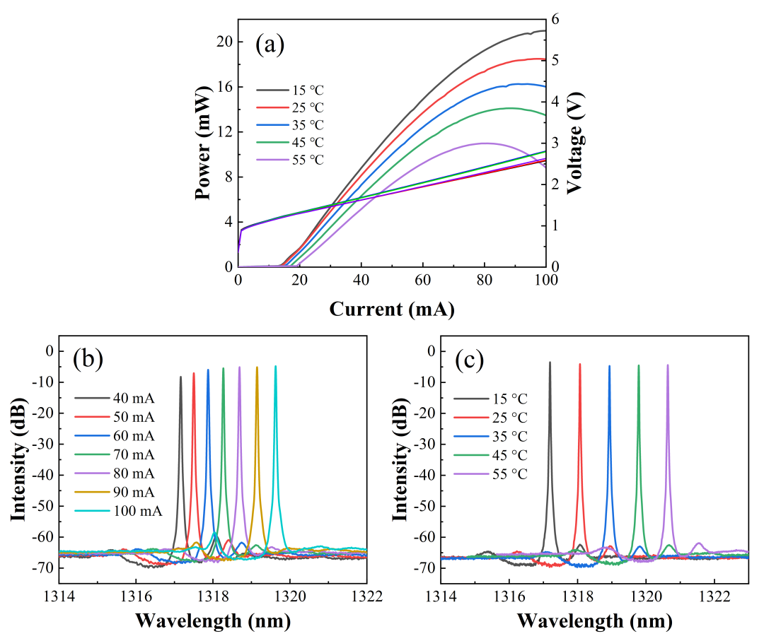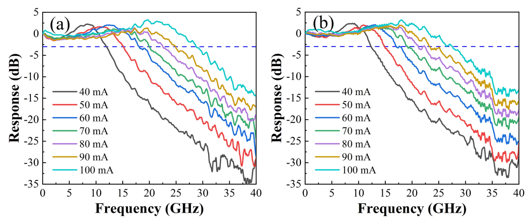 该激光器在20°C时阈值电流为14mA,100mA下最大输出光功率超过16mW,边模抑制比(SMSR)大于50dB(图2)。在100mA电流范围内工作时无跳模状态产生,工作状态稳定。在15°C至55°C的温度范围内均能维持良好的单模工作特性。在20°C工作温度下,当驱动电流达到100mA时,其直接调制带宽达29GHz(图3.a)。在40°C温度下,仍能保持约26GHz的带宽(图3.b),展现了优异的温度适应性。多批次器件测试数据表明,该器件具有高度一致的直流特性和高频响应特性。