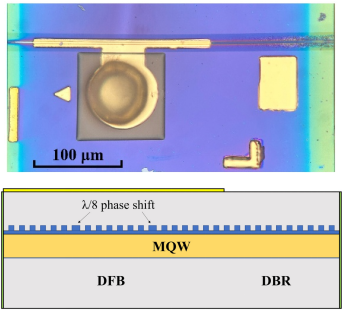 近期,中国科学院半导体研究所光电子材料与器件全国重点实验室梁松研究员团队发表了一项研究成果,报道了一种基于DL效应的低成本1.3微米波段分布式反馈(DFB)激光器。该研究创新性地在激光器器件上单片集成了无源DBR反射镜(图1),该反射镜采用与DFB激光器区相同的InGaAlAs多量子阱(MQWs)材料。其制造流程与常规单区DFB激光器几乎相同,无需复杂的对接生长工艺,显著提高了生产良率,有效降低了制造成本。