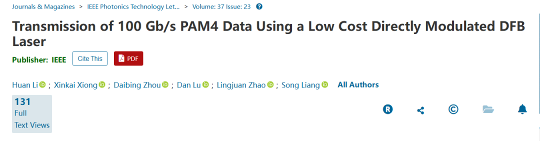 该成果以“Transmissionof100Gb/sPAM4DataUsingaLowCostDirectlyModulatedDFBLaser”为题,发表于《光子技术快报》(IEEEPhotonicsTechnologyLetters)。半导体所博士研究生李欢为该论文的第一作者,梁松研究员为该论文的通信作者。