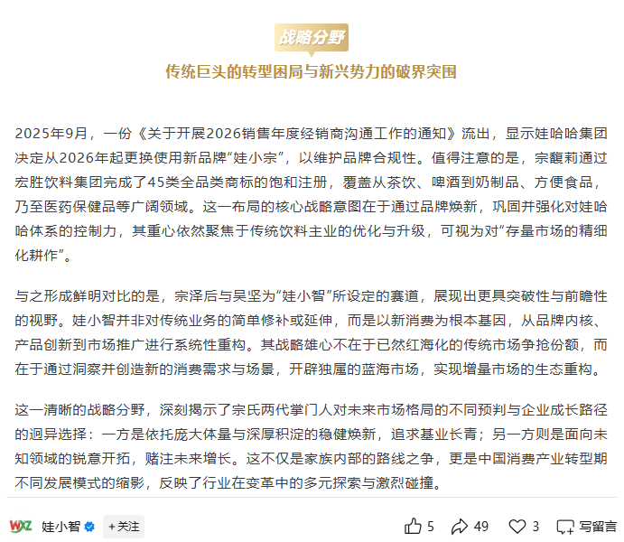 9月29日,娃小智官微发文《宗泽后VS宗馥莉娃小智VS娃小宗》,其中写道:当宗馥莉治下的娃哈哈即将换标“娃小宗”之时,宗泽后亦带领团队重返行业舞台,隆重推出又一品牌“娃小智”。