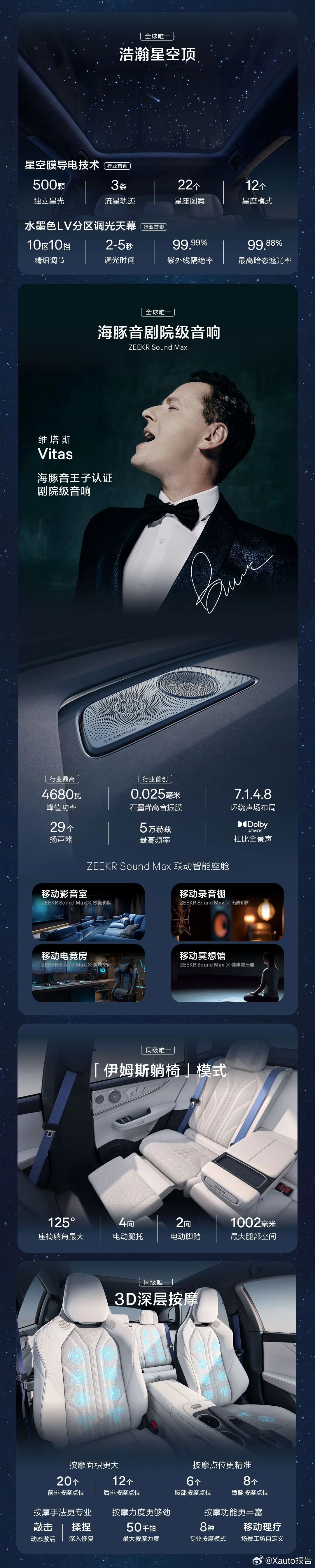 此外值得一提的是,新车带来了全球首创的浩瀚星空顶、峰值功率4680W的海豚音剧院级音响、伊姆斯躺椅模式、以及3D深层按摩等配置。2026款极氪001焕新极氪001猎装豪华新标杆焕新极氪001