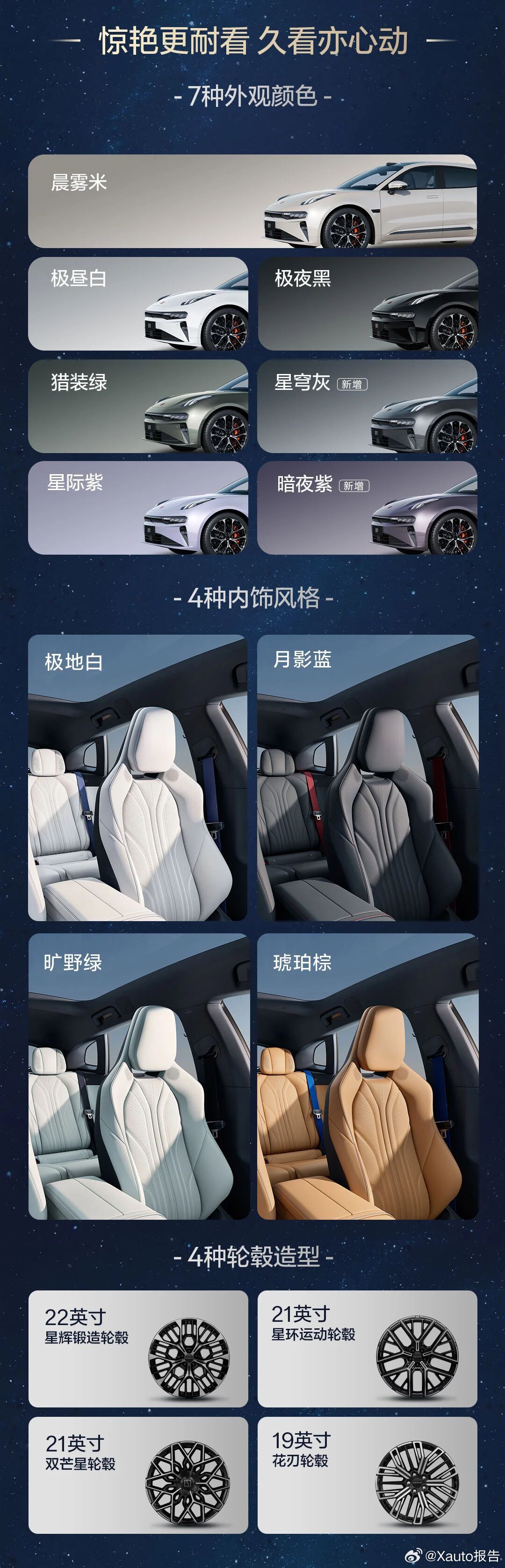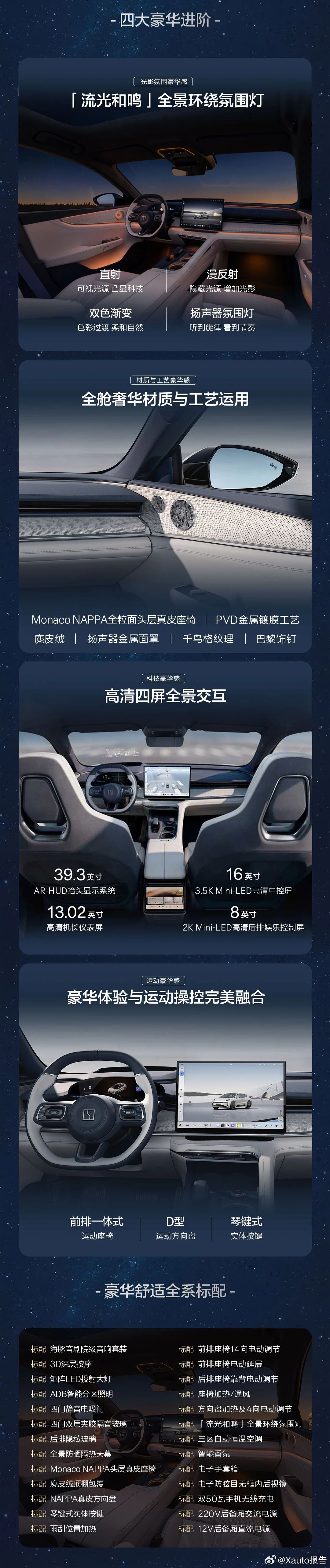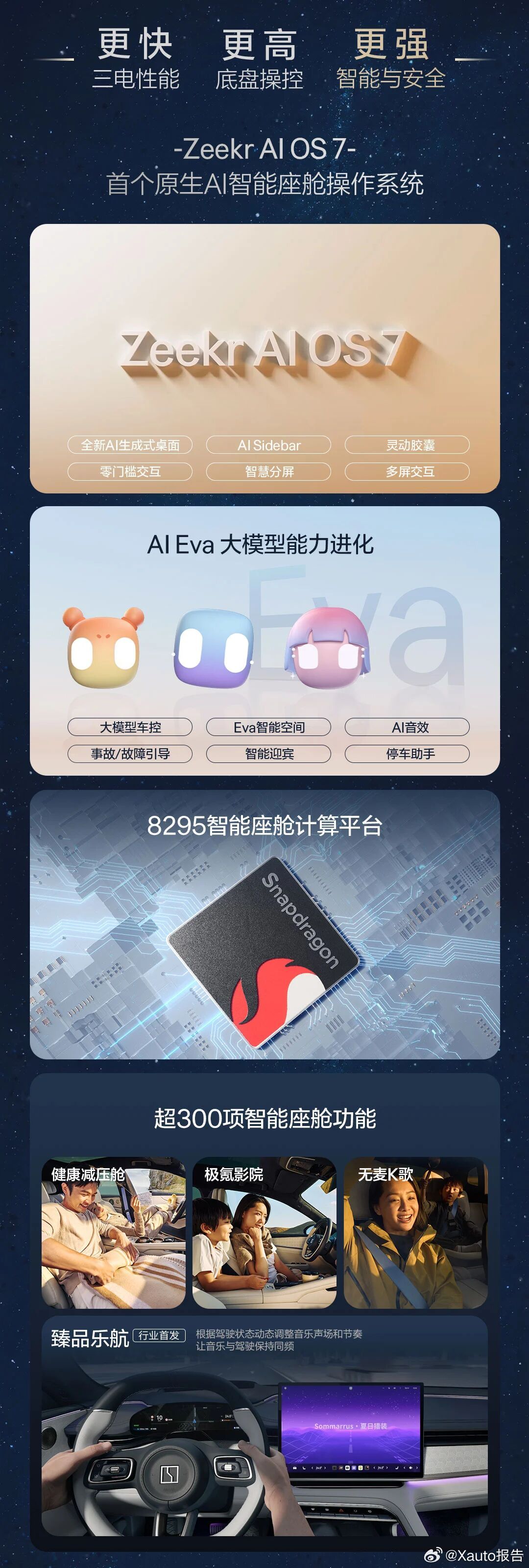 智能座舱方面,全系标配 39.3 英寸 AR-HUD 抬头显示系统,全系标配 16 英寸 3.5K Mini LED 高清中控屏,全系标配 8 英寸 2K Mini LED 高清后排娱乐控制屏,全系标配 13.02 英寸高清机长仪表屏,并全系搭载 ZEEKR AIOS7 操作系统,提供超 300 项智能座舱功能体验。