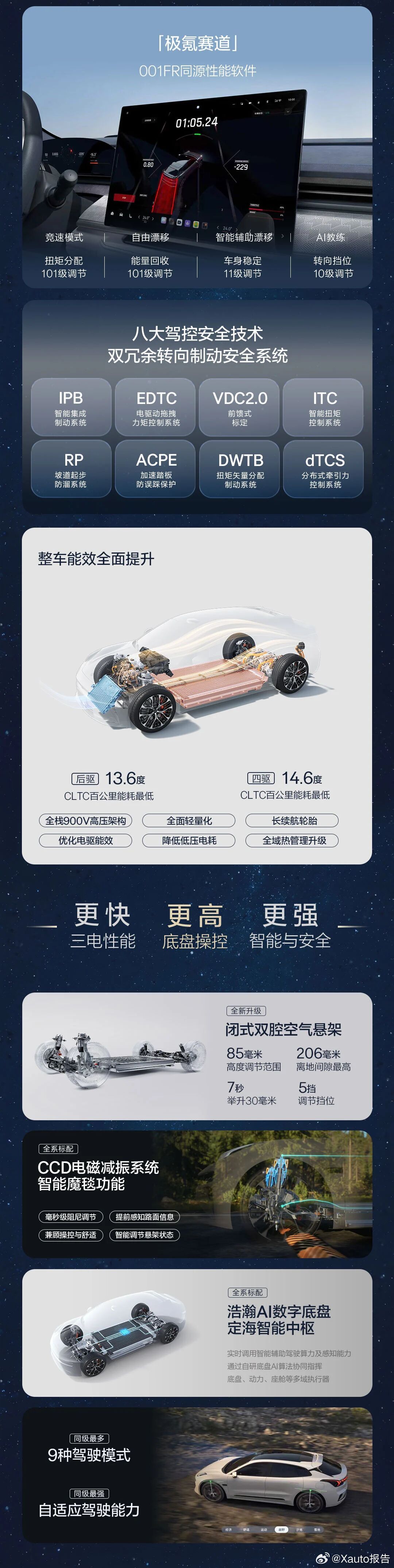 三电系统方面,焕新极氪001全系标配900V全栈高压架构,全系标配900V超快充大容量电池,全系标配900V高性能碳化硅电驱系统。