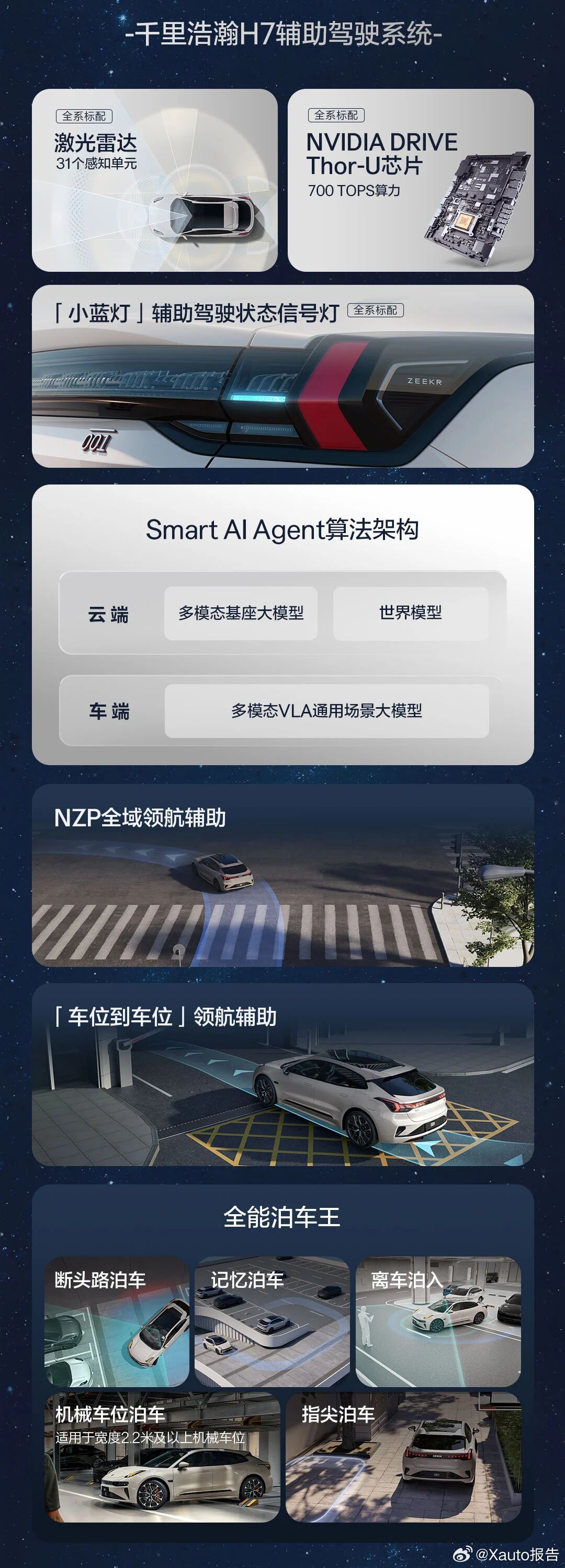 辅助驾驶方面,全系标配千里浩瀚H7辅助驾驶系统,全系标配激光雷达,并搭载英伟达Thor-U芯片700TOPS算力。