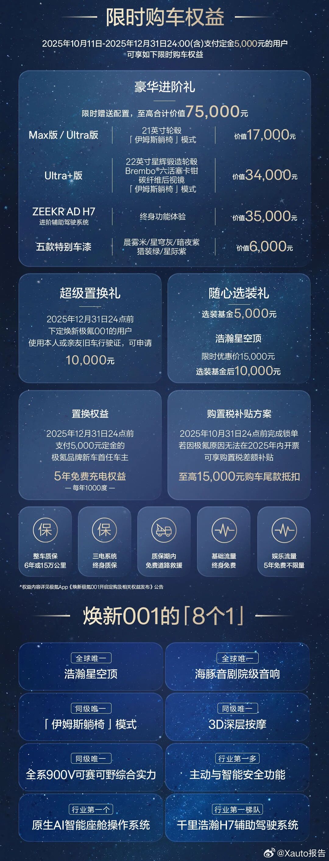10月11日晚,2026款极氪001正式上市,起售价26.98万元起,可限时叠加10000 元置换金。