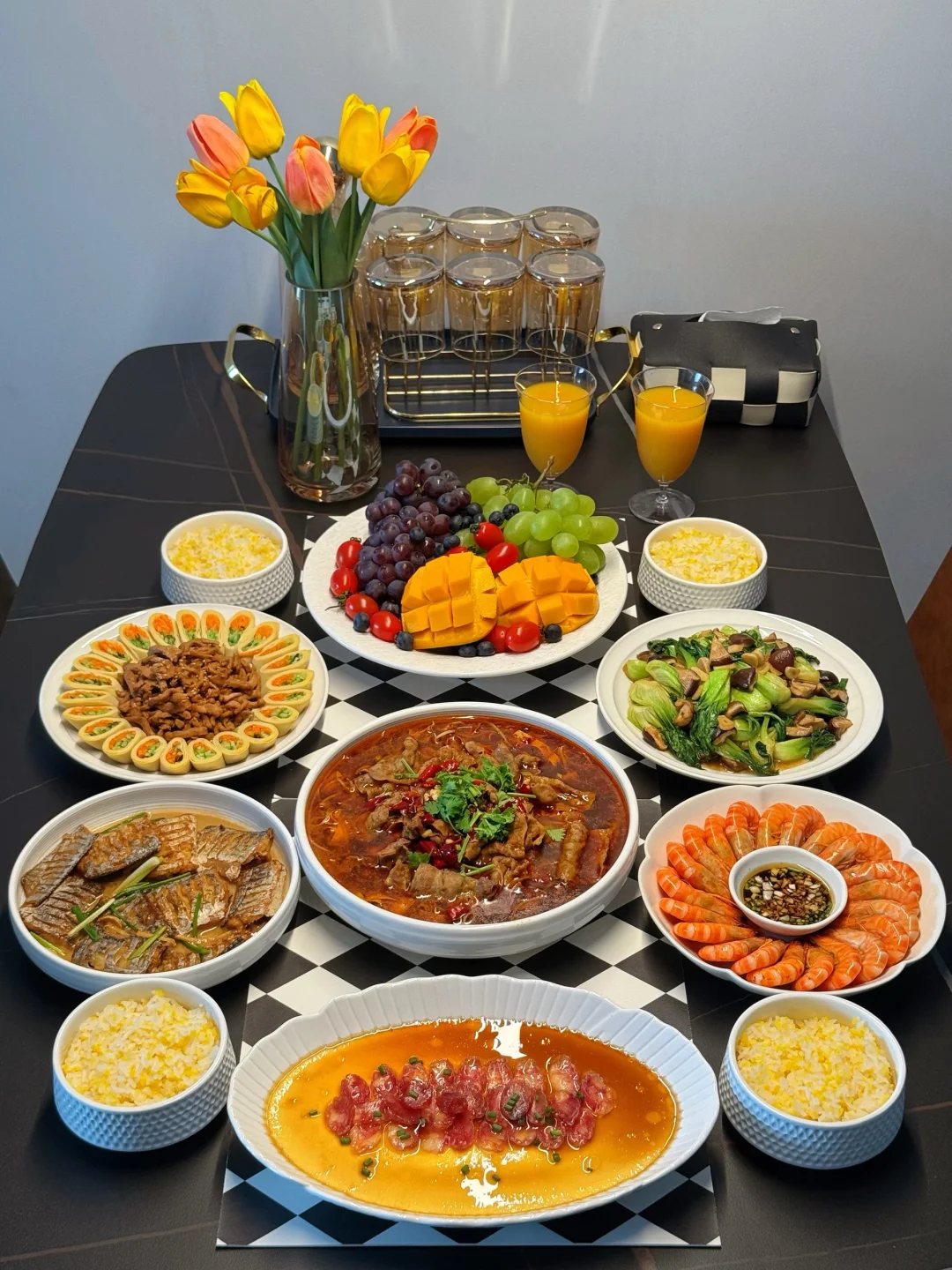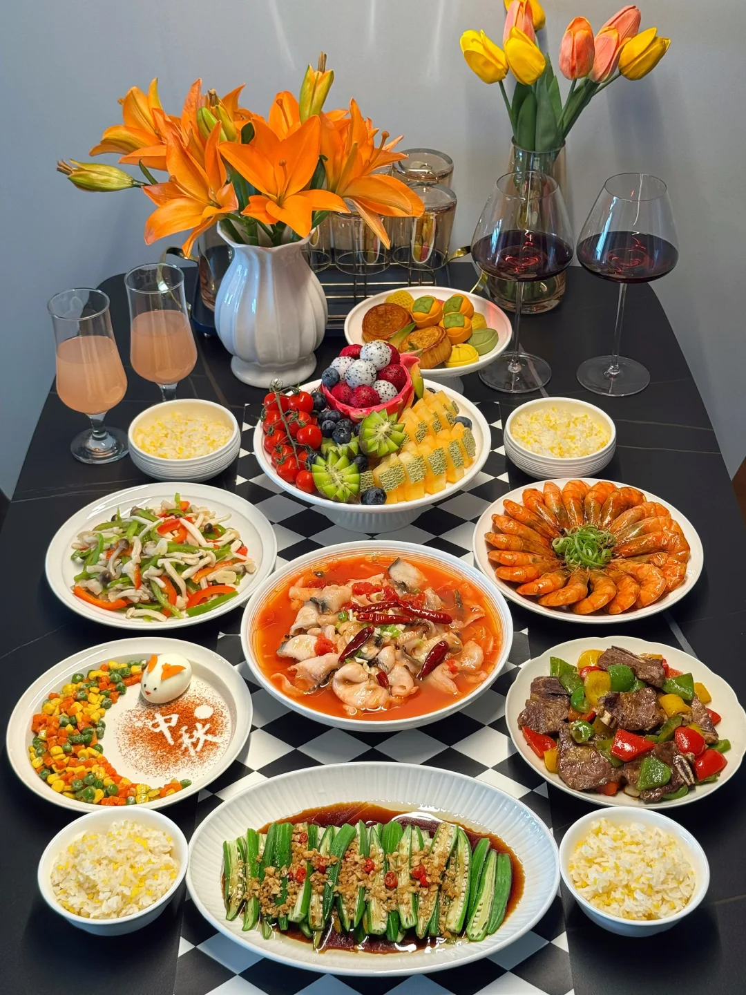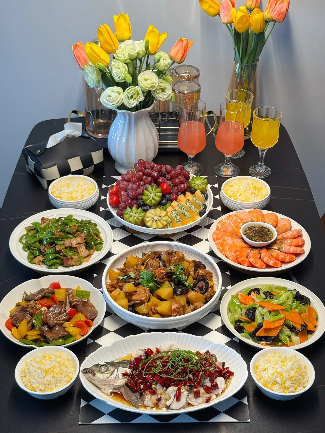 [三R]香菇土豆炖鸡、麻辣鱼、辣椒炒肉、香煎牛仔骨、胡萝卜木耳炒西芹、白灼虾、水果拼盘