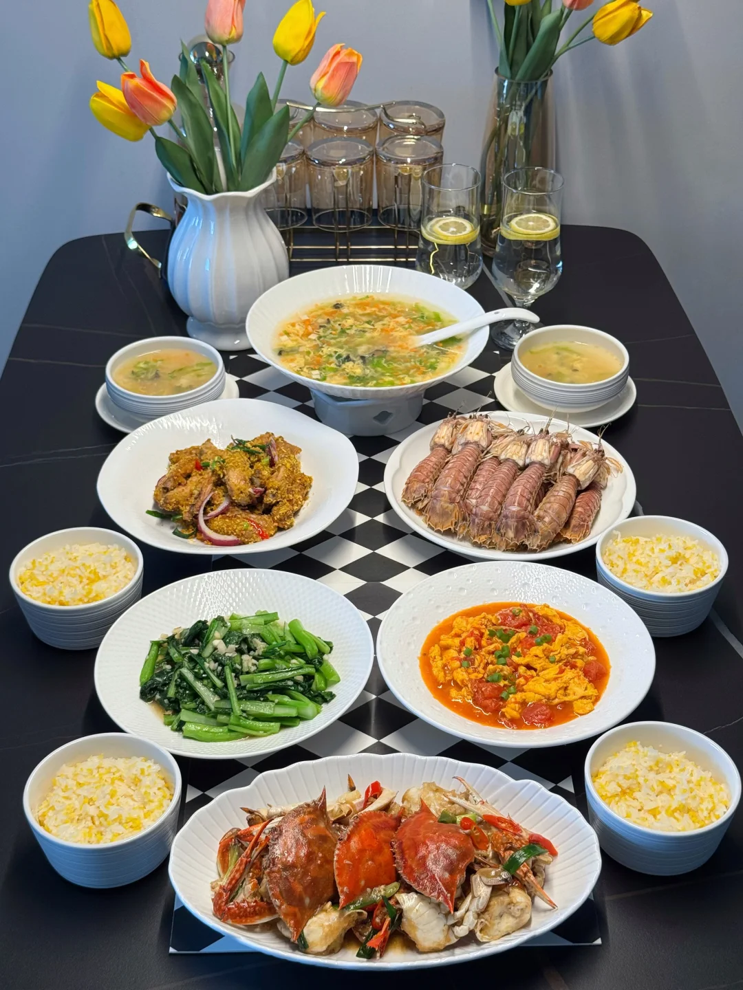 [六R]葱油梭子蟹、蒜蓉菜心、水煮皮皮虾、西红柿炒鸡蛋、蔬菜豆腐羹、避风塘炒鸡翅