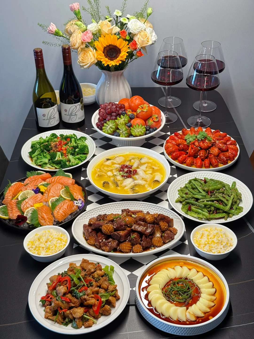 [四R]红烧鲍鱼排骨、金酸汤鱼、三文鱼刺身、青花椒鸡、蒜香小龙虾、玉子豆腐蒸蛋、干煸四季豆、蒜蓉西蓝花