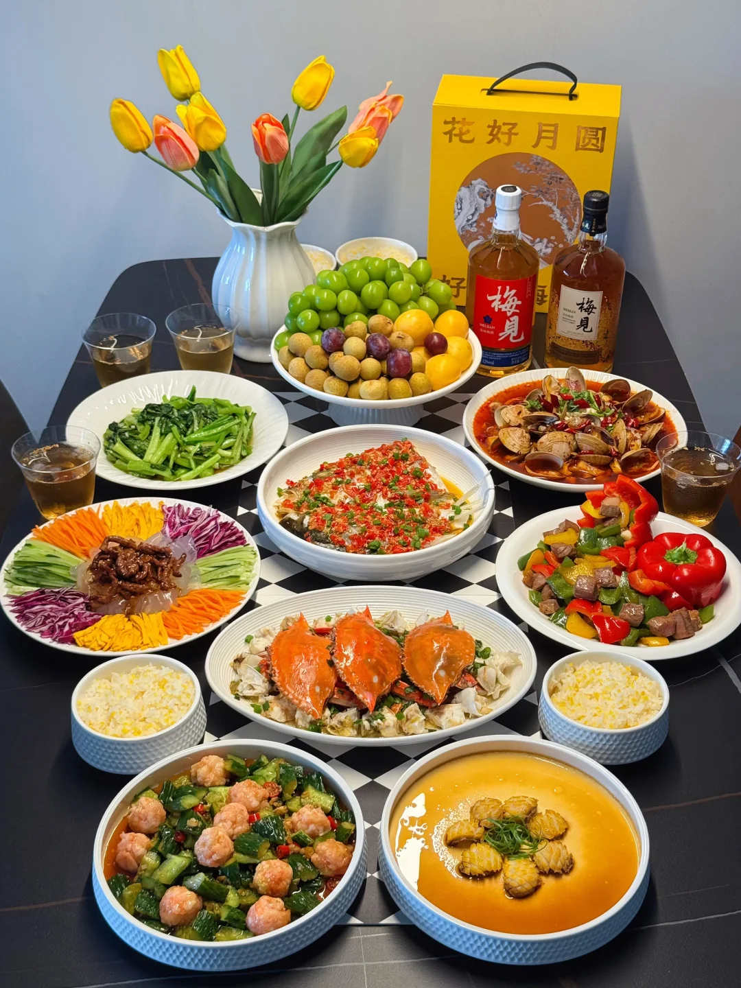 [五R]剁椒鱼头、清蒸梭子蟹、麻辣花蛤、蒜蓉上海青、彩椒牛肉、虾球拌黄瓜、鲍鱼蒸蛋、五彩大拉皮