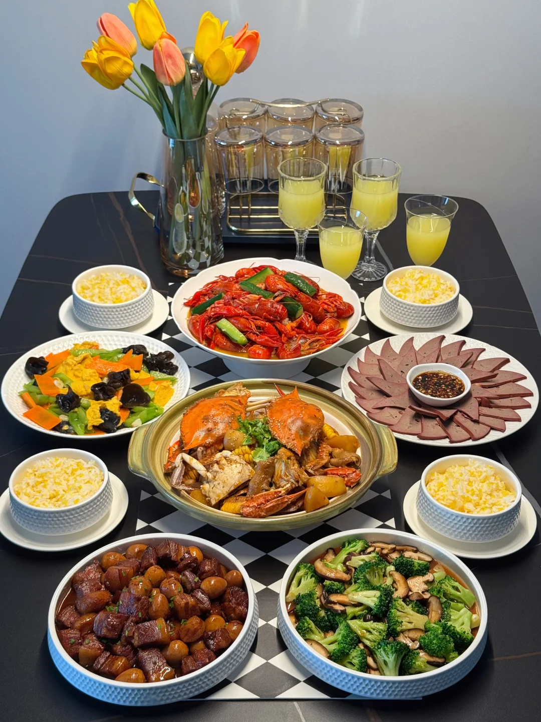 [七R]肉蟹煲、红烧肉炖鹌鹑蛋、西兰花炒香菇、黄瓜木耳炒鸡蛋、蒜蓉小龙虾、凉拌猪肝