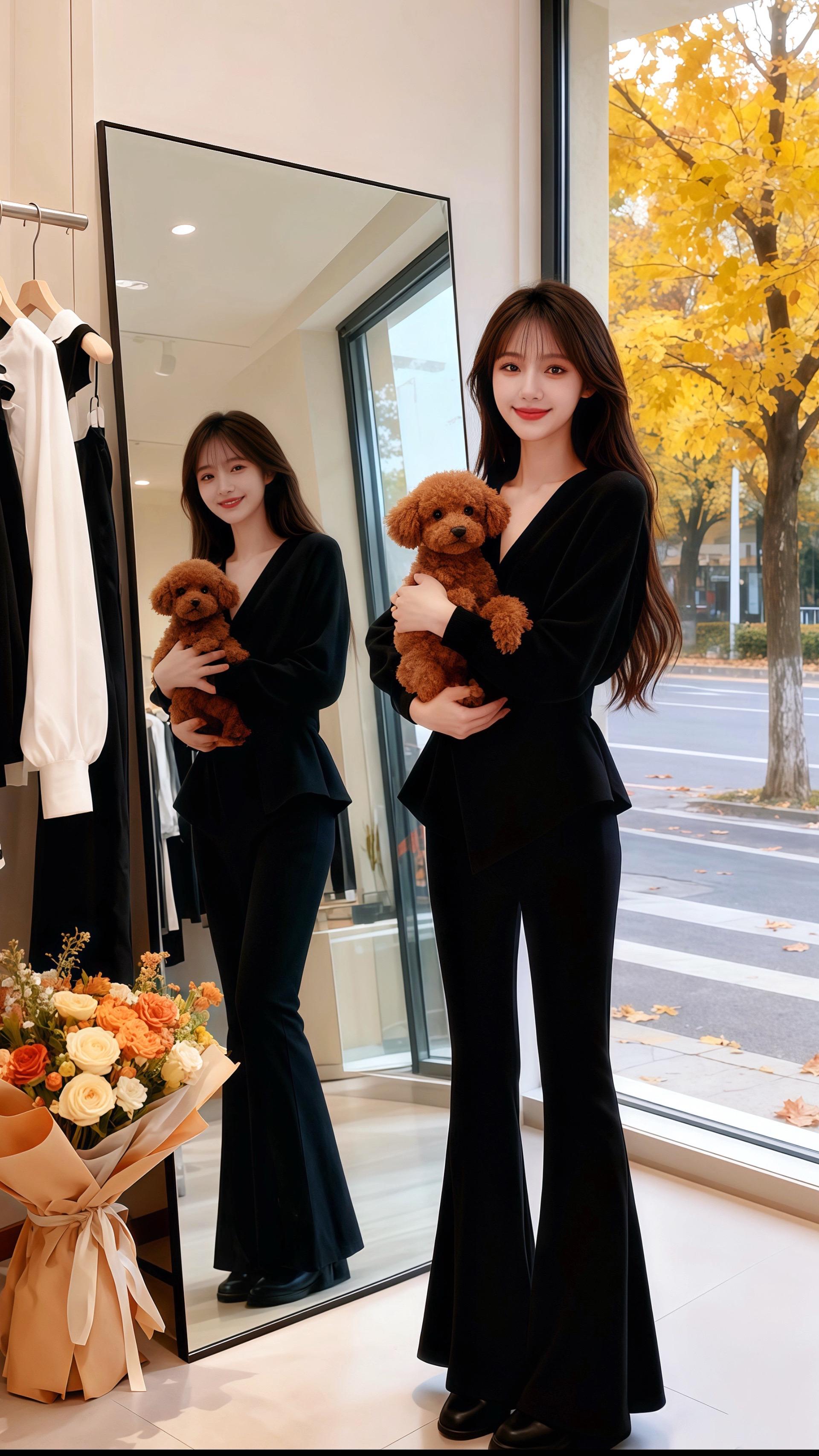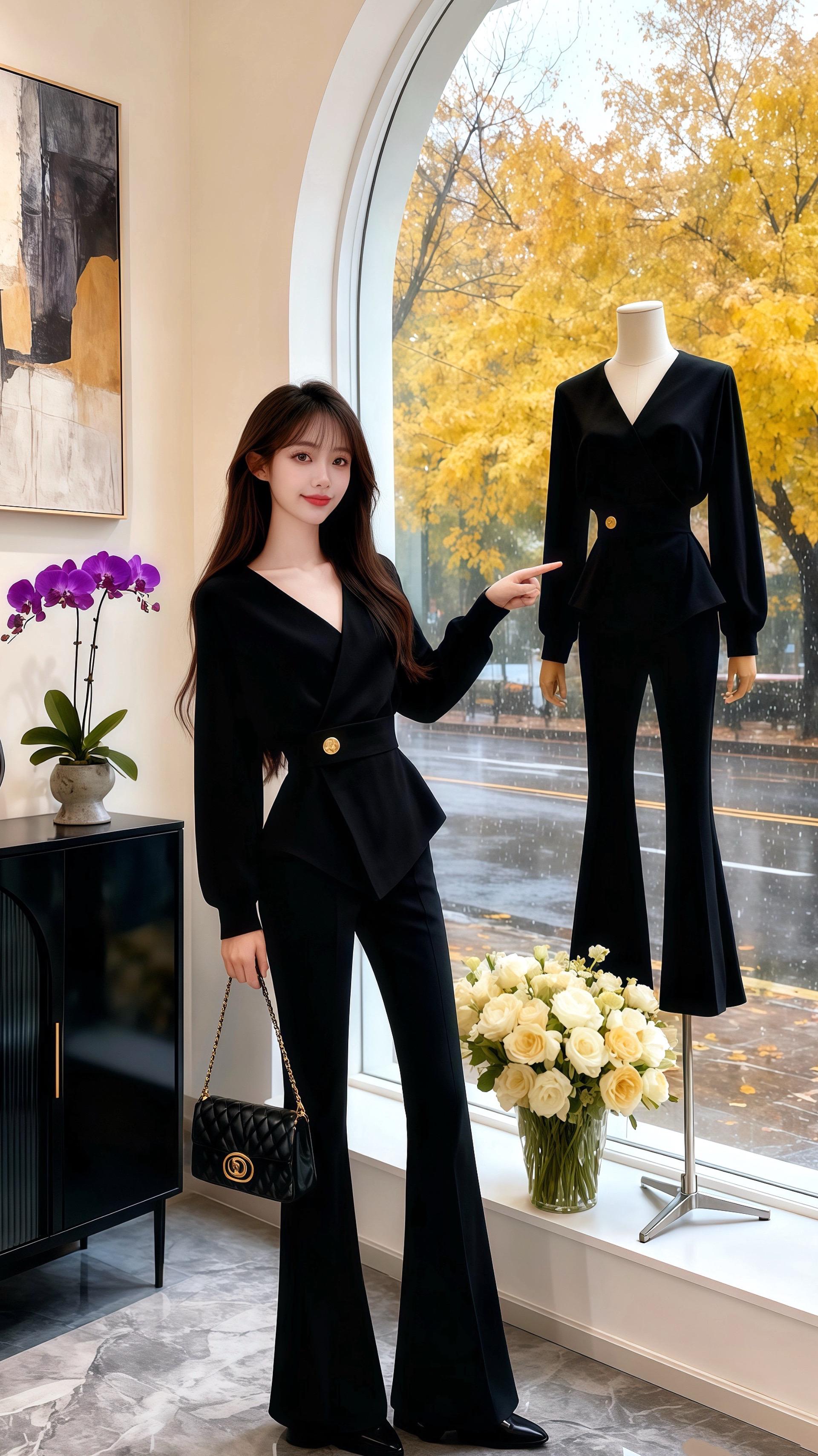 许妍抬眸,黑色V领套装衬得她肌肤胜雪,喇叭裤型随着她的动作轻轻摆动。“在想这套的版型真巧妙,收腰的设计很显身材。”