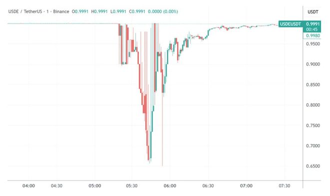 从周六早上5时20分左右开始,USDe在某知名交易所的现货价格突然脱锚,在之后的半个小时里最低跌至0.65美元。整场风波持续了近两个小时,期间多种主流货币的封装代币同步暴跌,共同形成币圈历史级别的大爆仓。