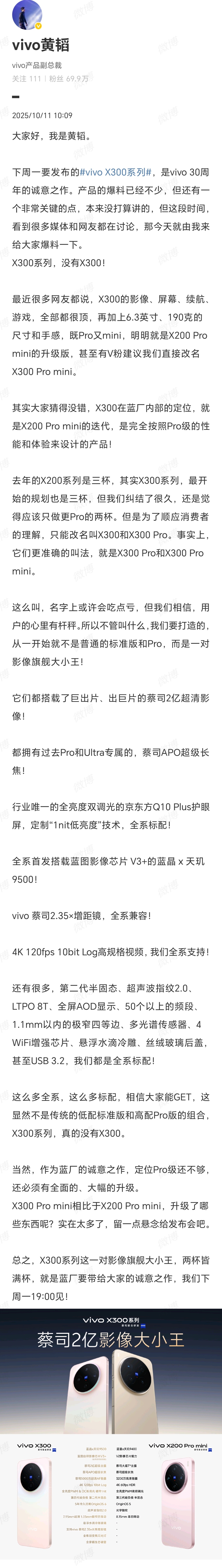 如果说上一代X200系列是三杯并行的旗舰矩阵,那么X300系列,就是vivo为用户带来的最纯粹的影像诚意大小王。价格上或许仍将延续上代Pro mini和Pro的起售价格,但使用体验已横向越级,一起期待下这款vivo 30周年的诚意之作吧。