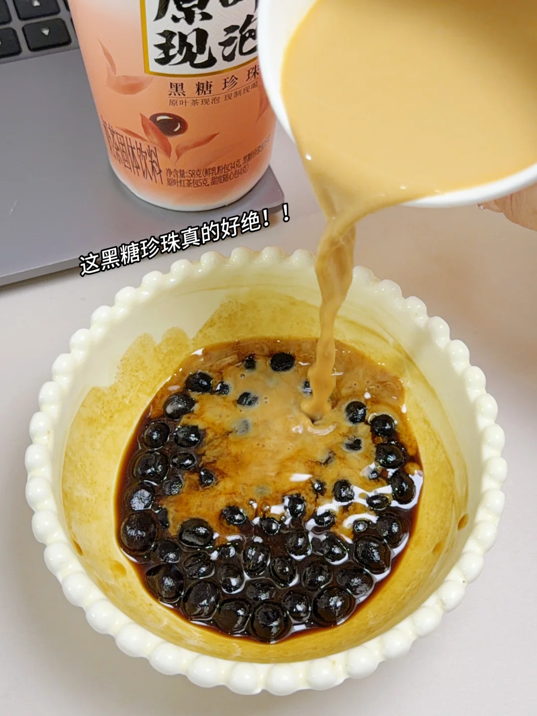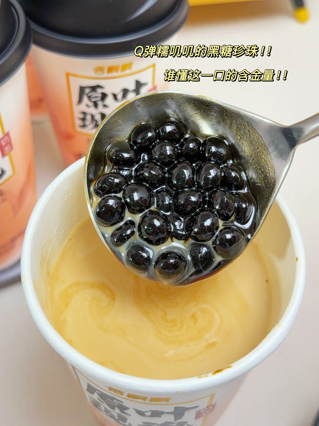 奶茶口感丝滑,里面的免煮黑糖珍珠泡开后敲Q弹有嚼劲!