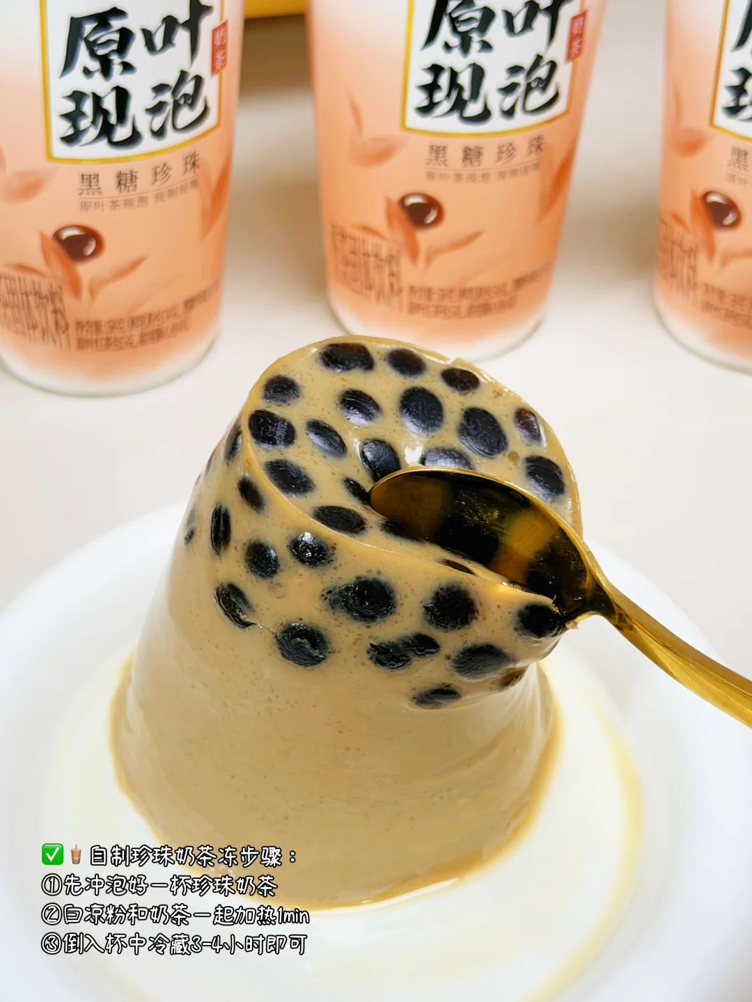 ✅最后给大家安利一个奶茶的隐藏吃法!可以和白凉粉一起冲泡,加热后再倒入杯子里面,放冰箱冷藏3-4小时后,就变成了一份可以嚼的黑糖珍珠奶茶冻!🤩一口下去原地封神!好好吃!做法很简单!大家快来学习一下吧!