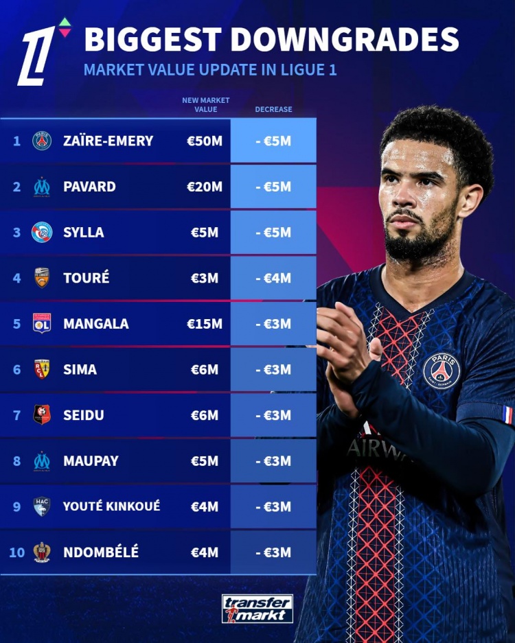 直播吧10月12日讯德国转会市场更新了法甲球员的身价,并列出身价下跌排名,扎伊尔-埃梅里、帕瓦尔、西拉-500万欧居首。