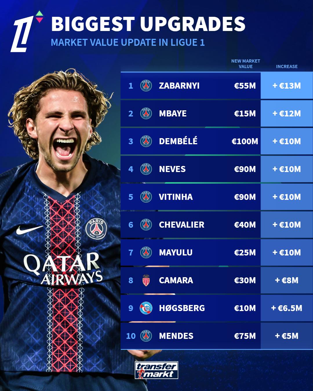 虎扑10月12日讯德转今日发布了两份榜单:分别为法甲身价更新后的涨幅和跌幅前十球员。其中,涨幅榜中巴黎球员占据八席;同为巴黎球员的法国中场小将埃梅里却成为跌幅榜头名。