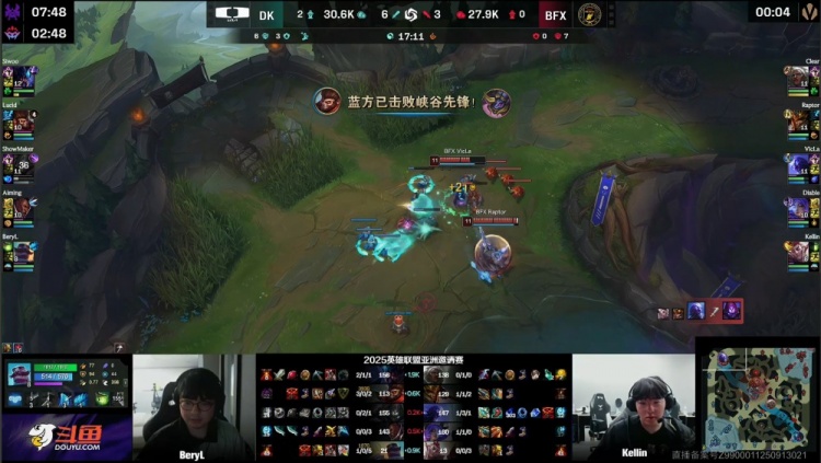 [22:48]BeryL布隆下路开大留人,Clear安蓓萨起飞被杀,DK推掉BFX下路高地塔,经济领先5k。