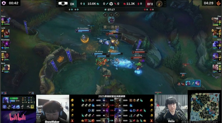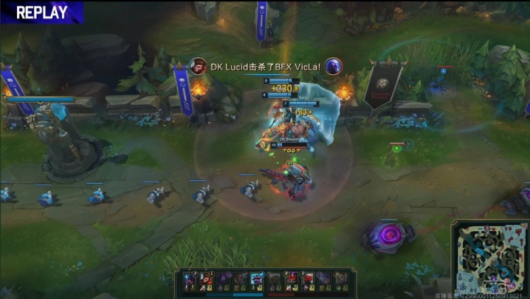 [7:18]Lucid入侵BFX蓝buff,河道开战,Diable芸阿娜被集火送BeryL布隆一血,随后中路许哥没闪被BFX三人逮捕,Lucid猴子与BeryL前来野区集火反杀Vicla瑞兹,DK整体打出1换2,Lucid拿到三条巢虫。