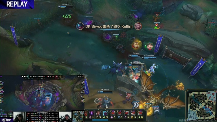 [23:53]Vicla瑞兹上路推线,Siwoo雷克塞挖断Vicla的TP,双方拉开。小龙团,Raptor皇子正面盖DK两人,许哥玛扎绕后开吸,Siwoo雷克塞双杀,Kellin洛抬空,DK打出0换5团灭BFX,回头吃掉大龙,经济领先1w。