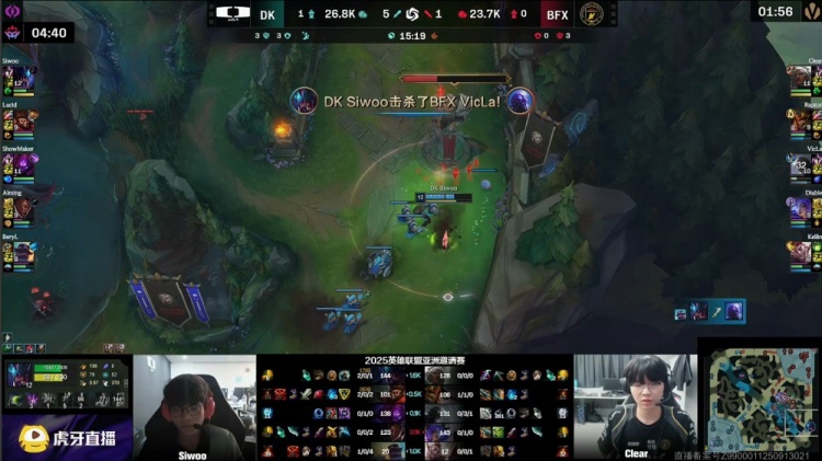 [15:32]Vicla瑞兹下路又被BeryL布隆晕住后送Siwoo人头,野区混战,Diable芸阿娜点掉Siwoo,Clear难逃一死,DK打出1换2,经济领先3k。