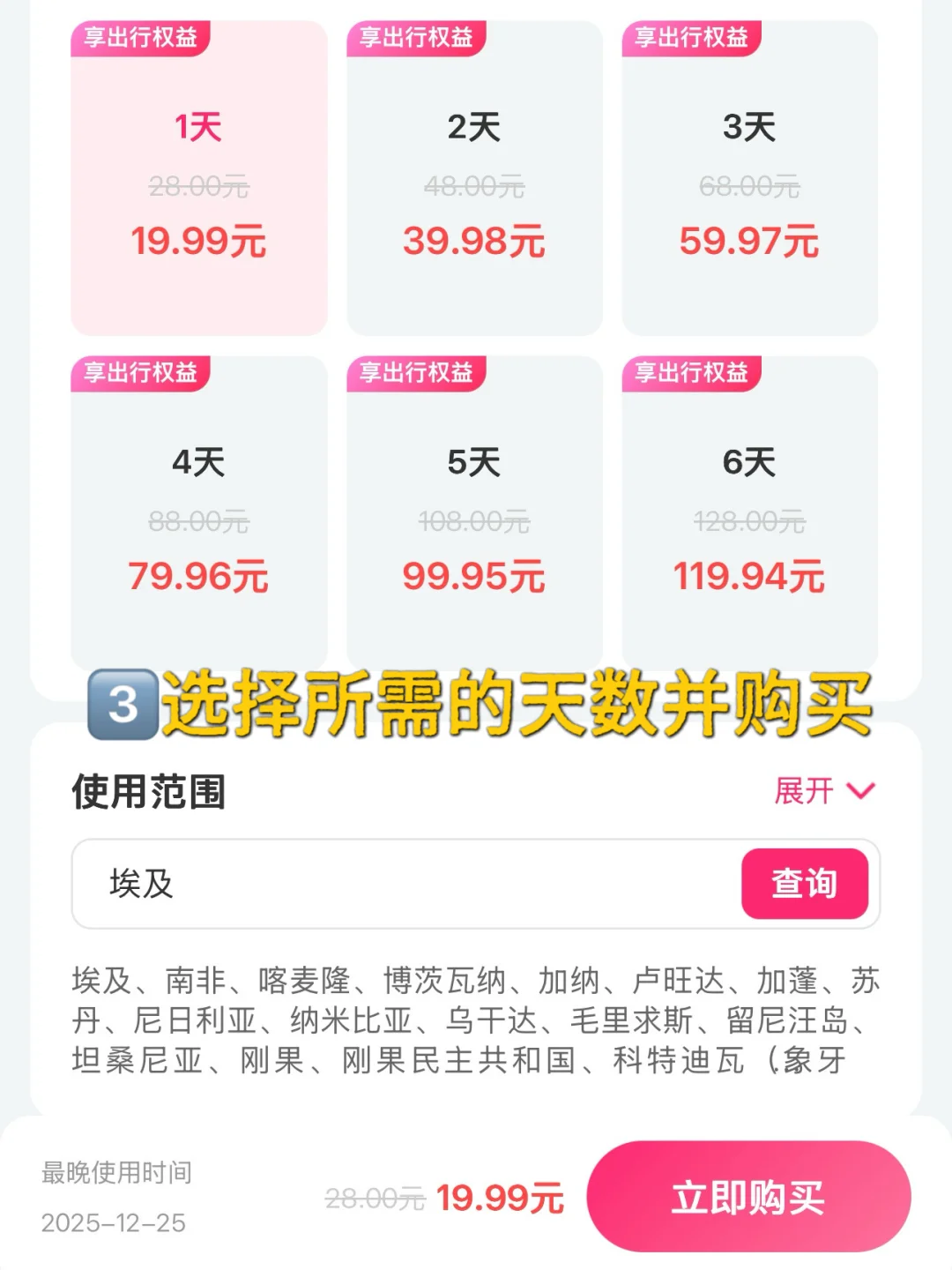 这次去埃及,朋友给我推荐直接在无忧行APP上买流量套餐。不用换卡直接落地就能用,超级方便!而且19.9元就能拥有一天流量包,非常划算!