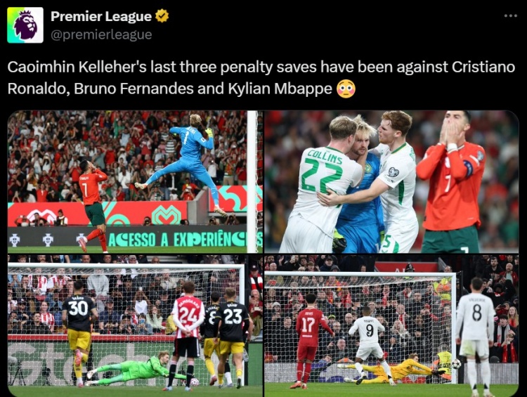 直播吧10月12日讯英超官方发布数据,凯莱赫近3次扑点分别扑出了C罗、B费和姆巴佩的点球。