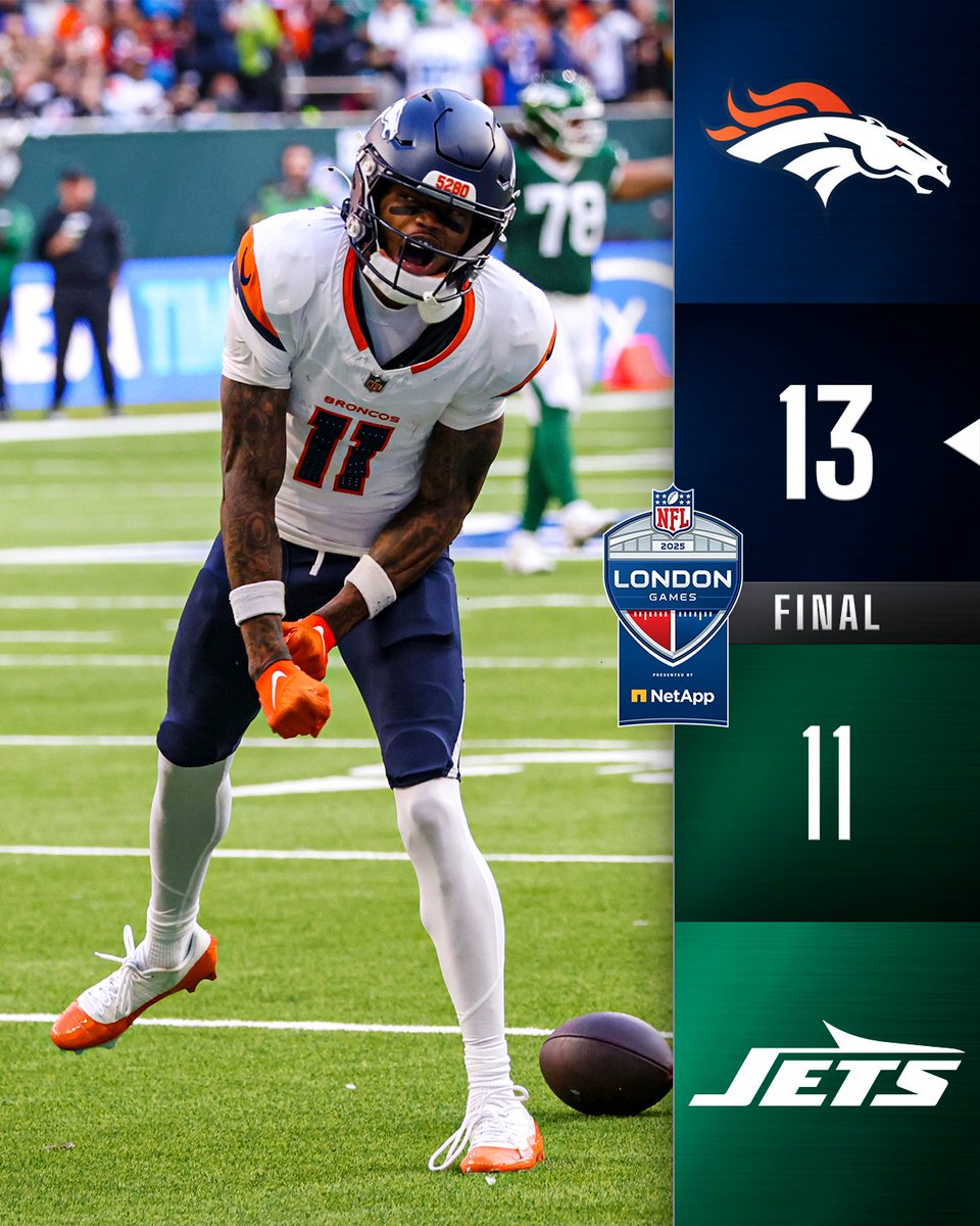 NFL官方X账号发推特报道。最终比分:@Broncos在伦敦赢得了一场防守大战。@NFLUKIRE