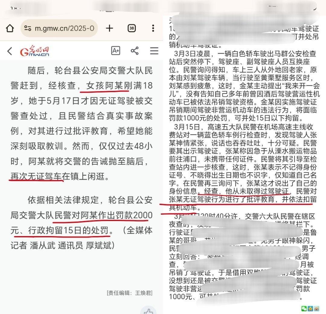 有人说对违规女司机的处理总是偏轻,还为此拼了张图1。然而事实真是如此吗? 图2里,女子单某挡救护车,还拒绝挪车,被拘五天;男子乔某挡救护车,但认错态度好积极配合调查,所以是罚款。 图3也是。女孩阿某第一次无证驾驶被批评,两天内第二次无证驾驶,所以被拘15天。——这和图1里 “男子因违规被暂扣驾驶证,期间无证驾驶”如出一辙,拘15天的处理也完全一致。 与之相比,两位张某(图1 图3)都是从未取得驾驶证,无论男女都是罚款处理。 所以事实是:处罚看的是过错程度和认错态度,而不是男女。 当然,我不奢求某些性别叙事入脑的人看懂这一点。