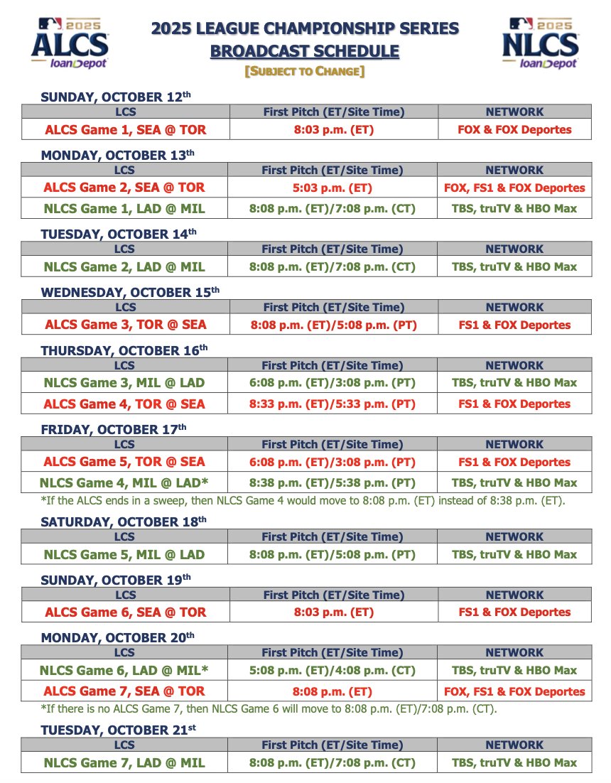 MLB官方X账号发布推文称:#ALCS和#NLCS的完整转播赛程表!