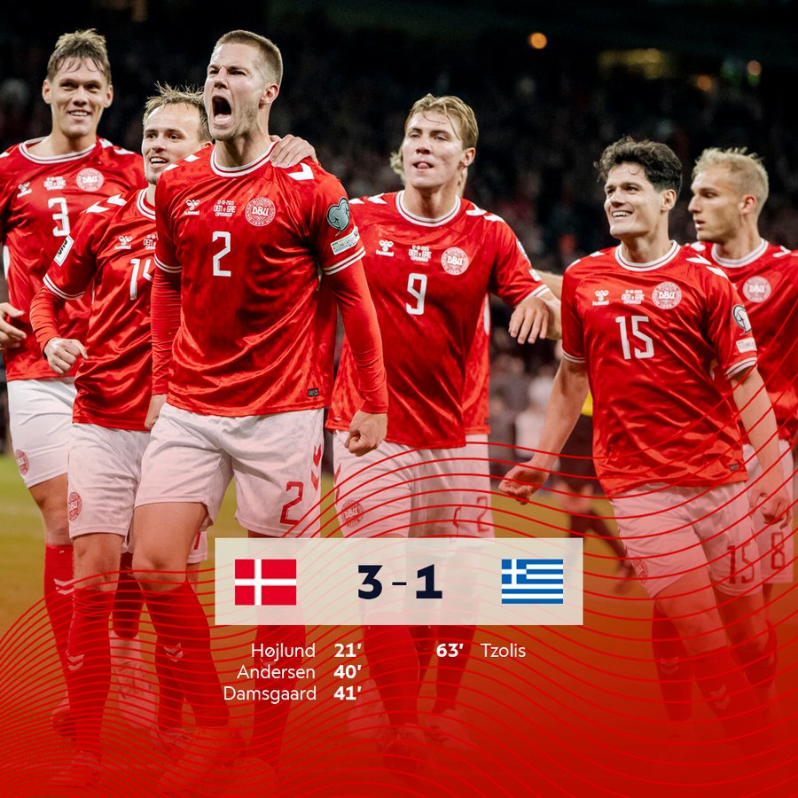 虎扑10月13日讯北京时间10月13日凌晨,2026年世界杯欧洲区预选赛第一阶段小组赛第8轮,丹麦迎战希腊。比赛中,希腊后防多次失误,丹麦抓住机会,霍伊伦、约西姆-安诺生和达姆斯高先后破门,迅速建立三球领先优势。希腊由措利斯扳回一城,但无法挽回败局。最终,丹麦以3比1战胜希腊,取得重要三分。