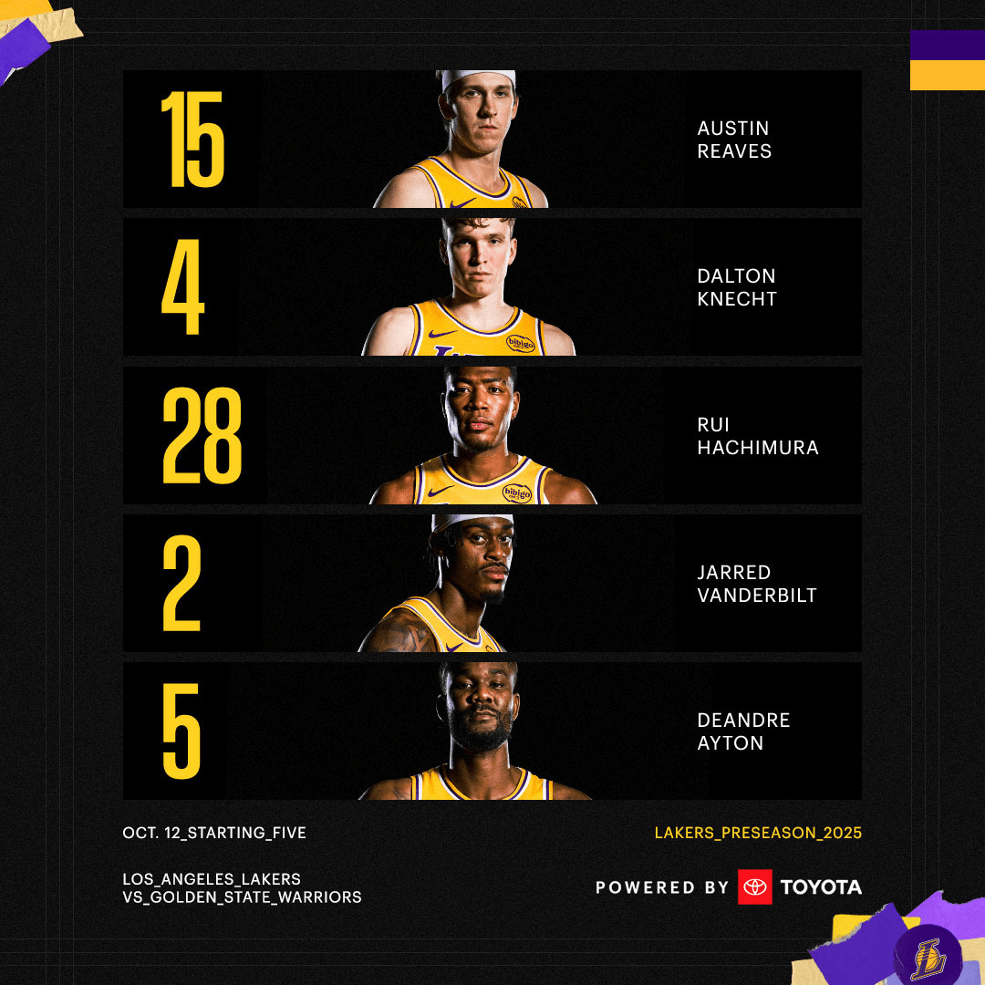 湖人本场首发:奥斯汀-里夫斯、多尔顿-克内克特、八村垒、贾里德-范德比尔特、德安德烈-艾顿。