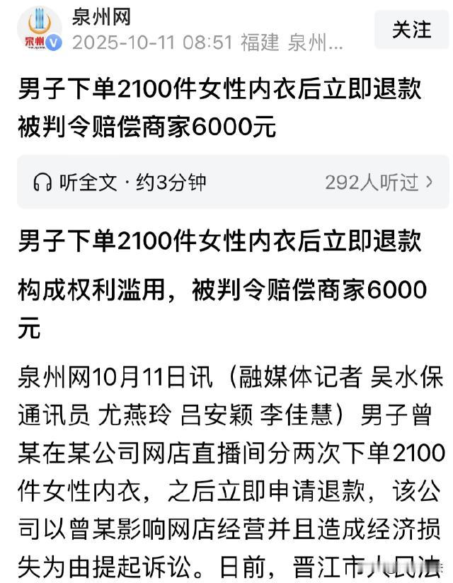 福建晋江,有个卖女性内衣的直播间,男子曾某进入直播间下单1000件内衣后全额秒退,第二天晚上,他又下单1100件再次秒退,这导致直播间乱套,直播中断,公司损失巨大,便起诉了曾某,曾某却解释称第一次误触,第二次不记得了。 据了解,有个专门卖女性内衣的直播间,平日里主播们凭借着热情和专业,吸引了不少顾客,生意也算红火。可去年10月,这个直播间却遭遇了一场意想不到的事。 10月17号晚上,直播间准时开播,主播刚一露面,熟练地拿起一件内衣开始介绍,从材质到设计,从舒适度到搭配,说得头头是道。 可刚介绍没几分钟,意外就发生了,屏幕上突然显示商品库存为零,主播愣了一下,还没反应过来怎么回事,就看到直播间弹幕里满是抱怨和不满。 原来,就在开播不久,男子曾某又出现了,他之前就干过一件让人摸不着头脑的事,10月16号那天,他进了直播间,手指轻轻一点,直接下单了1000件内衣。 当时运营小妹看到订单,眼睛都亮了,兴奋地喊着爆单了,还赶紧和其他工作人员分享这个好消息。 可谁能想到,没过一会,曾某就全额秒退了这笔订单。 而这次,曾某更加过分,一下子下单了1100件内衣。这庞大的订单量,让库存瞬间清零,直接打乱了直播间的节奏。 主播看着空荡荡的库存,又看着不断流失的观众,急得额头直冒汗,直播也不得不被迫中断。 这两场折腾下来,直播间的损失可大了去了,两场直播的销售额直接归零,原本期待的好生意就这么泡汤了。 而且店铺的信誉分也大幅下滑,后续几天的流量直接掉了三成,这对于一个靠流量吃饭的直播间来说,无疑是沉重的打击。 公司上下都气坏了,大家一致认为曾某就是故意捣乱。 他们觉得曾某作为一个男性,短时间内大量购买女式内衣,而且每次下单不到半小时就退款,连物流信息都没生成,这哪里是正常的消费行为,分明就是别有用心。 于是,公司一纸诉状把曾某起诉了,要求他停止捣乱并赔偿损失。 审理时,当问曾某为什么要这么做时,他居然说第一次下单是喝多了误触,第二次则完全不记得了。这解释听起来实在是敷衍至极,让人难以信服。 公司这边也拿出了详细的证据,包括曾某两次下单和退款的时间记录、直播中断前后的流量对比、销售额损失情况等等。这些证据,直指曾某的不当行为。 从曾某的行为来看,他两次短时间内大量下单女式内衣又秒退,这可不是什么正常的消费举动。 1,当曾某在直播间下单时,他与商家之间就形成了买卖合同关系。 根据民法典第四百九十一条规定,当事人一方通过互联网等信息网络发布的商品或者服务信息符合要约条件的,对方选择该商品或者服务并提交订单成功时合同成立。 曾某下单成功,意味着合同已经成立。 2,可他随后又秒退,这种行为严重扰乱了商家的正常经营秩序。 商家基于正常销售预期安排库存、人力等资源,曾某的突然大量下单又退款,让商家前期准备付诸东流。 曾某称第一次是误触、第二次不记得,这种说法难以站住脚。 作为一个具有完全民事行为能力的成年人,误触一次尚有可能,但短时间内连续两次出现这种异常行为,很难让人相信是无意为之。 而且从行为结果看,他的行为直接导致直播间库存清零、直播中断、销售额归零、店铺信誉分下滑、后续流量减少等一系列严重后果,这明显超出了正常消费行为可能带来的影响范围。 3,商家要求曾某停止捣乱并赔偿损失,是合理的诉求。 商家投入大量资源进行直播销售,有权在一个稳定、有序的环境中开展经营活动。 曾某的行为破坏了这种环境,给商家造成了实际损失,商家有权依据法律维护自身权益。 最终审理认定:曾某的行为扰乱了商家的正常经营活动,属于权利滥用,判决曾某赔偿商家6000元。 您对这件事有什么看法呢? 类似曾某这样滥用权利的行为出现后,又该如何更好地防范呢?