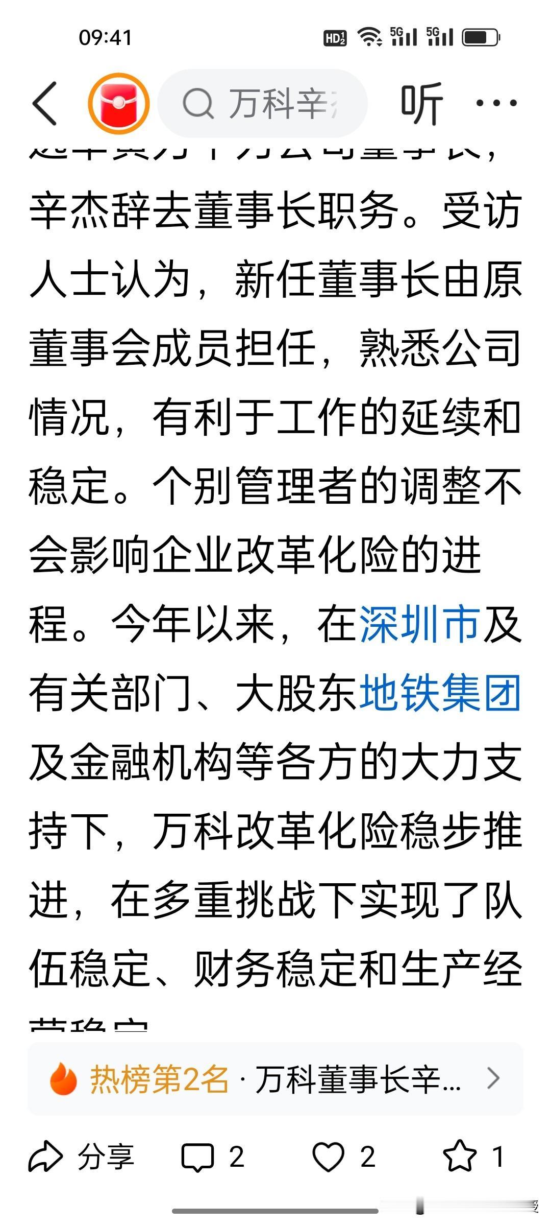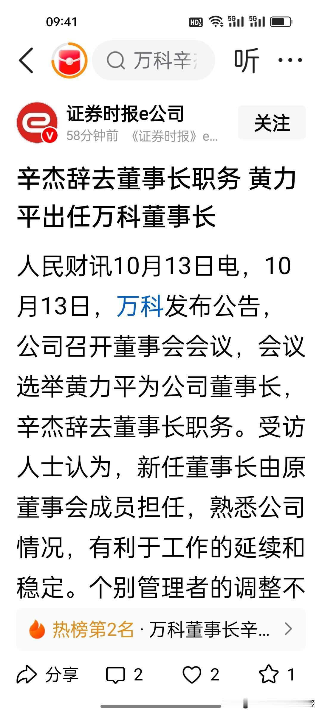今天,万科港交所的公告坐实了周末《新浪财经》发文的真实性。辛杰辞去董事长,目前由深铁总经理黄力平担任万科董事长,还是原来深铁班子的延续。看来万科一时之间也不存在会有危机四伏的局面,但是港交所公告中并没有透露辛杰的去向,是不是正在接受有关部门的调查还不得而知。今天万科没有一字跌停,很多股民总算松了一口气。