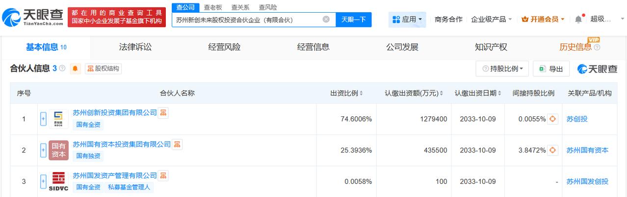 出资额171.5亿 天眼查工商信息显示,近日,苏州新创未来股权投资合伙企业(有限合伙)成立,执行事务合伙人为苏州国发资产管理有限公司,出资额171.5亿人民币,经营范围包括股权投资、创业投资、以自有资金从事投资活动。合伙人信息显示,该合伙企业由苏州创新投资集团有限公司、苏州国有资本投资集团有限公司、苏州国发资产管理有限公司共同出资。 天眼查信息: