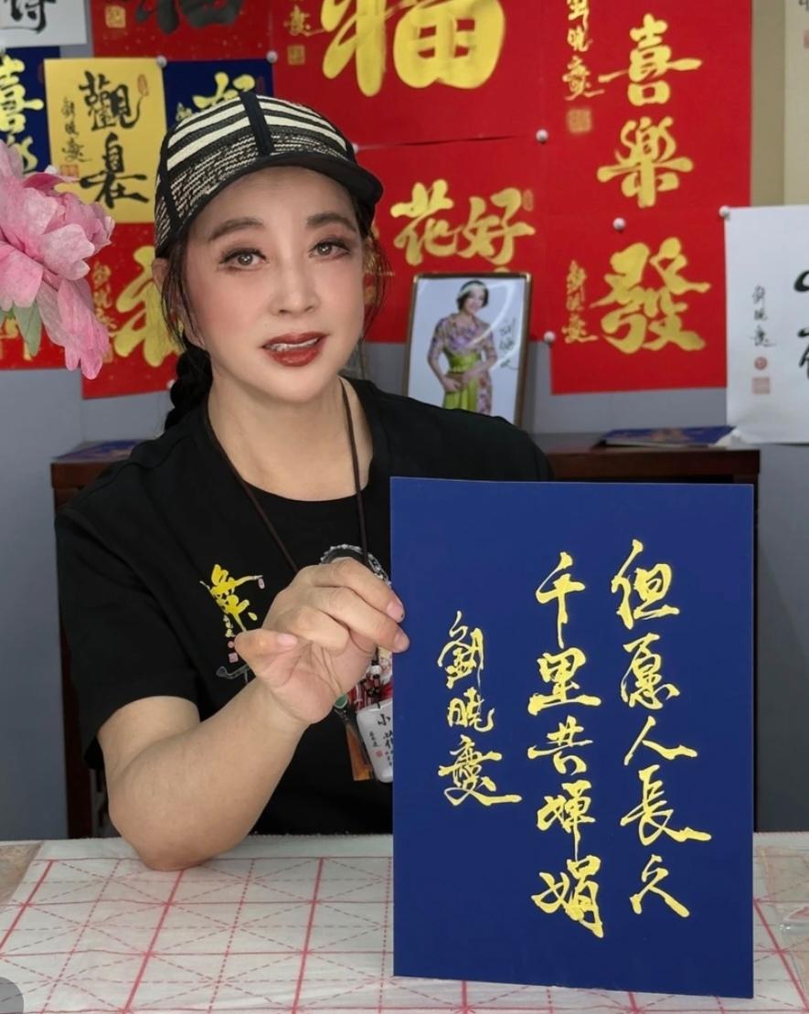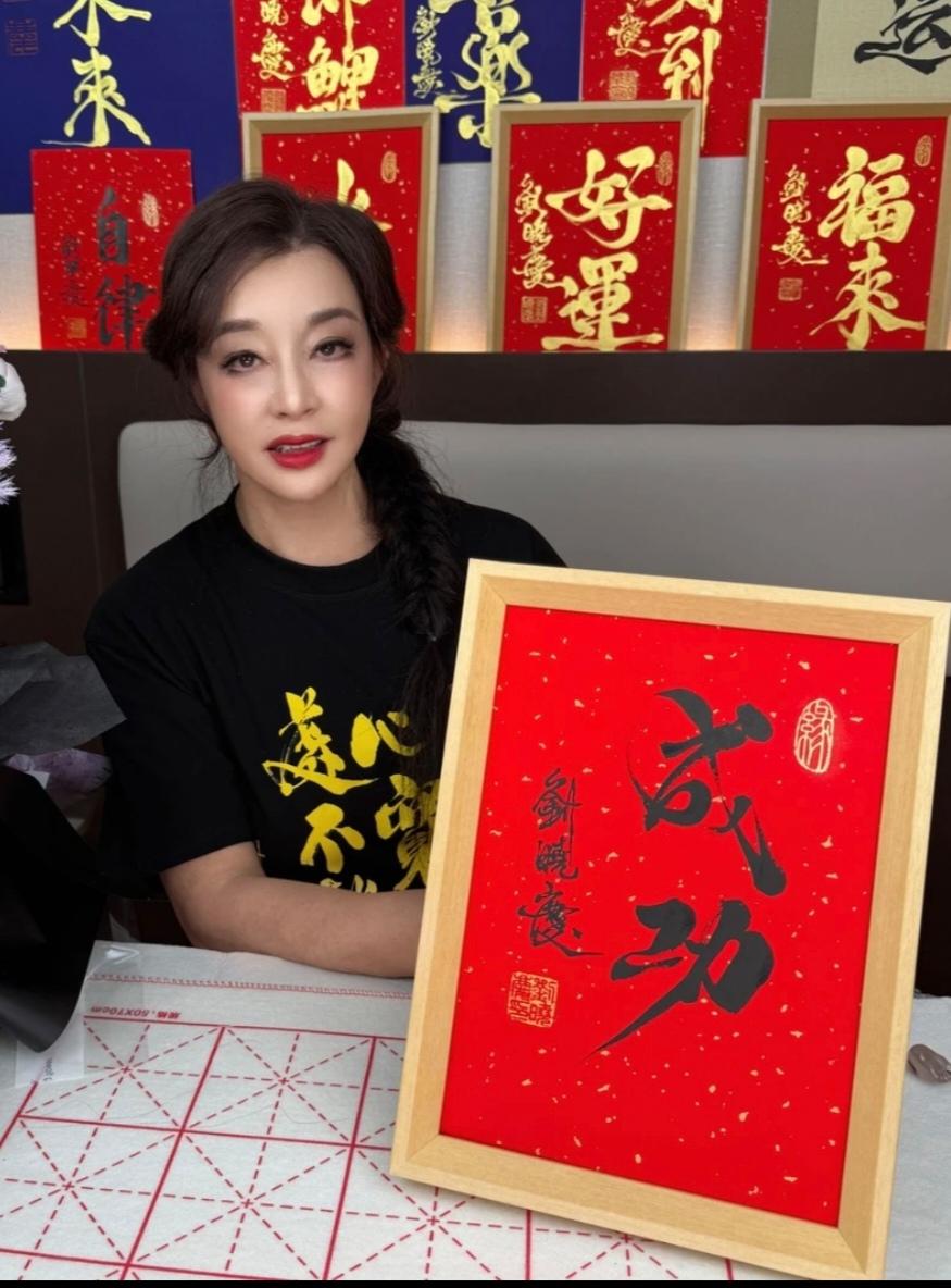 第一次刷到李明同学写字的时候,感觉这书法怎么这么眼熟呢,可就是想不起来究竟像谁,就觉得这字跟传统大相径庭,肯定跟当代的一位书家很像。 这不刷到刘晓庆跳《大王叫我来巡山》了,我一下想起来了,李明同学肯定学的是刘晓庆,刘晓庆直播过写书法卖书法。 下面是李明同学跟刘晓庆的书法,大家看一样不,我觉得神似!