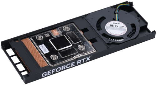 整张显卡的外观样子非常纤薄,颜色也主要以黑色为主,并且无光,风扇中心贴有影驰的GALAXLOGO,正面一半为金属散热板,侧面印有GEFORCERTX,虽然看着很像专业卡,但RTX的LOGO依旧表示着,这是一张RTX系列显卡。
