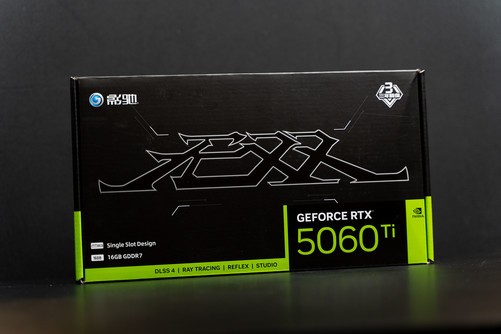 显卡外包装主要以简约为主,继承无双系列的传统,包装盒上只印了无双二字,左下角印着单槽设计与16GBGDDR7的产品特点,意味着这是一款显存拥有16GB大小的RTX5060Ti。