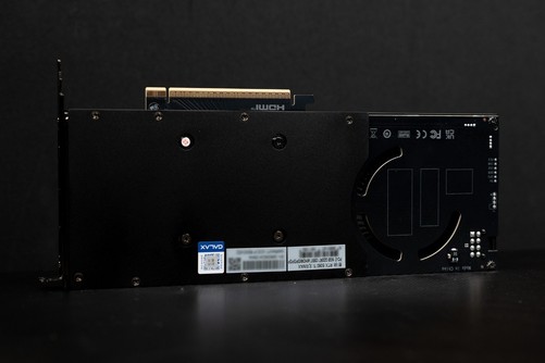 显卡背面与前面板风格一致,依旧是黑黑的简约风,并且在涡轮风扇背部对PCB板进行了镂空处理,这使得风扇能更好的从正面与背面吸入冷风,大大增加了进风效率。并且金属背板也不对背板进行完全覆盖,对核心背部和背部显存有着散热辅助作用。