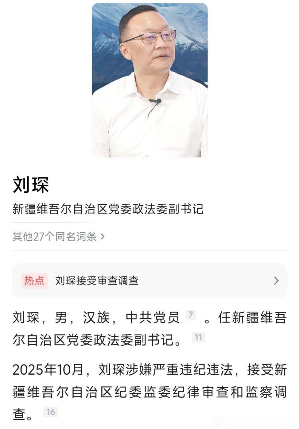 据新疆维吾尔自治区纪委监委10月13日消息:新疆维吾尔自治区党委政法委副书记刘琛涉嫌严重违纪违法,目前正接受新疆维吾尔自治区纪委监委纪律审查和监察调查。热点现场