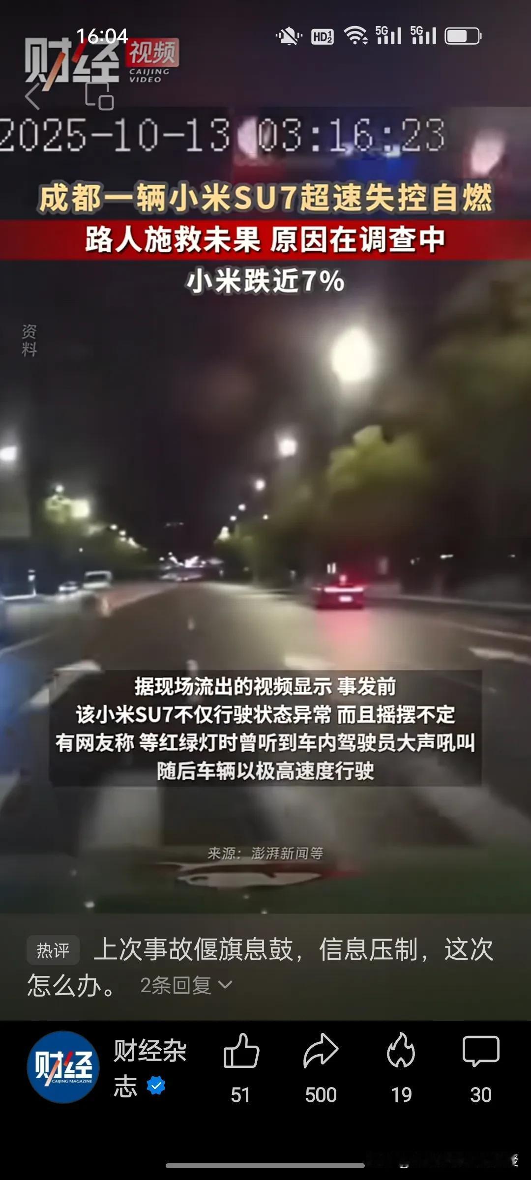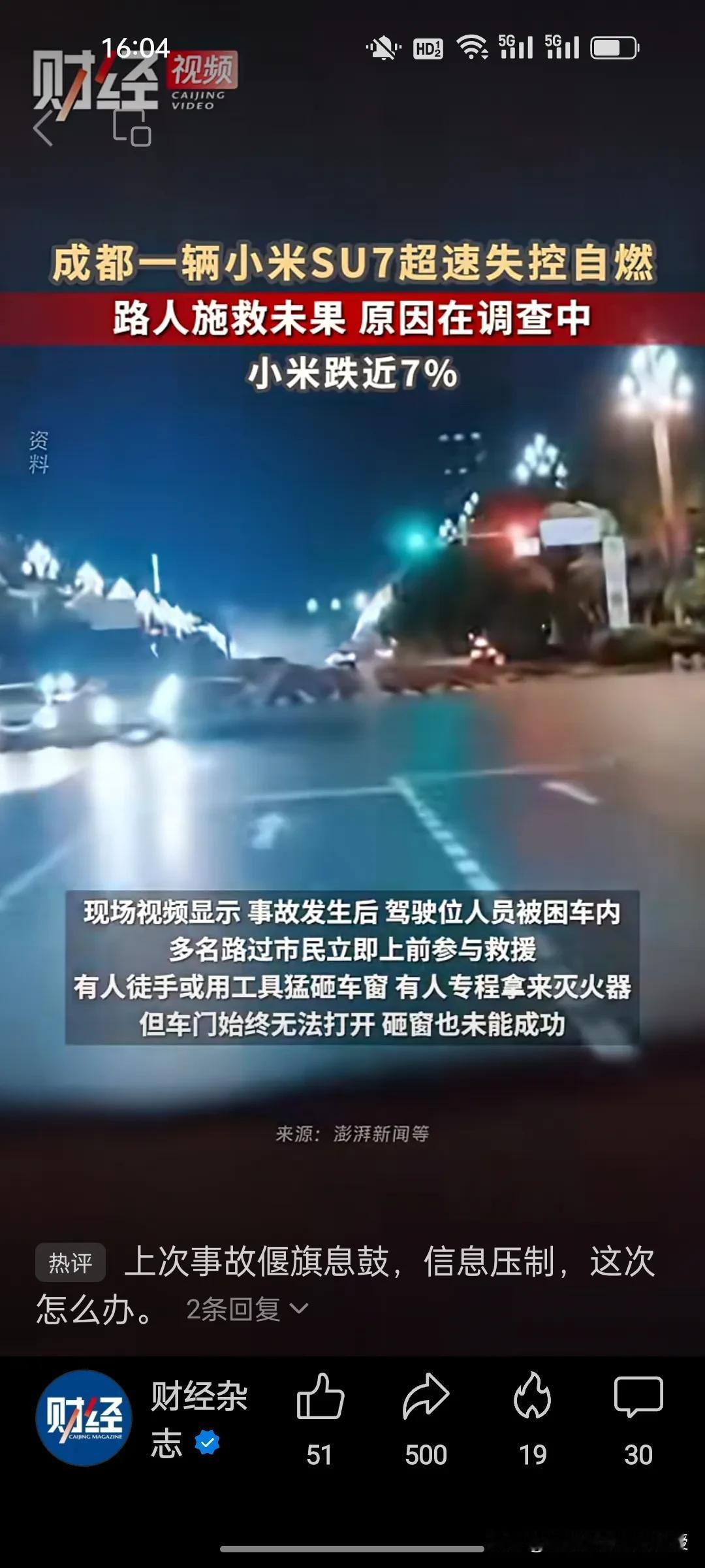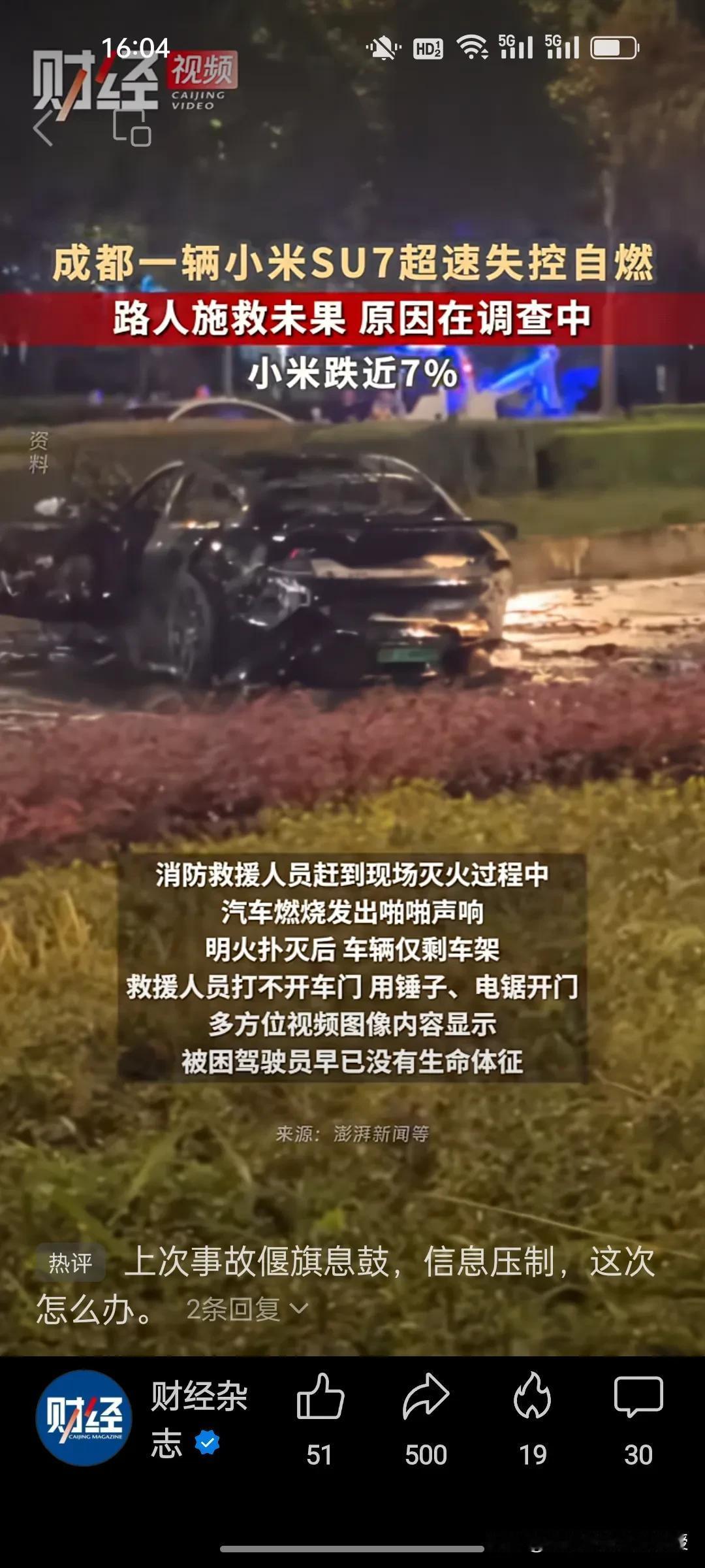 今天凌晨又是一起小米SU7事故。成都一辆小米SU7超速失控自燃,车内驾驶员已经遇难,这是今年看到的第二起令人伤心的事故。 有网友称看到车内驾驶员大叫,随后车辆以极高速度行驶,撞向绿化带后起火,有多位市民帮忙救援,但是车门打不开,砸窗也未能成功。后来消防救援人员用锤子和电锯才打开门。电子车门把手安全性确实是个大问题。关键时刻要是能打开车门,也许就不会发生这起惨剧。小米今天股价也跌了超5%。 小米之前两次召回了SU7刚上市之初的14.7万辆,不知道这次事故车是不是在召回的范围内。 雷军之前说,小米汽车是全网被黑最惨的品牌之一,呼吁全社会打击黑公关。 不过,无论市场争议如何,汽车从诞生那天起,评价一辆车的好坏,安全永远是凌驾于一切性能、设计之上的核心底线,任何时候都容不得半点妥协与侥幸。