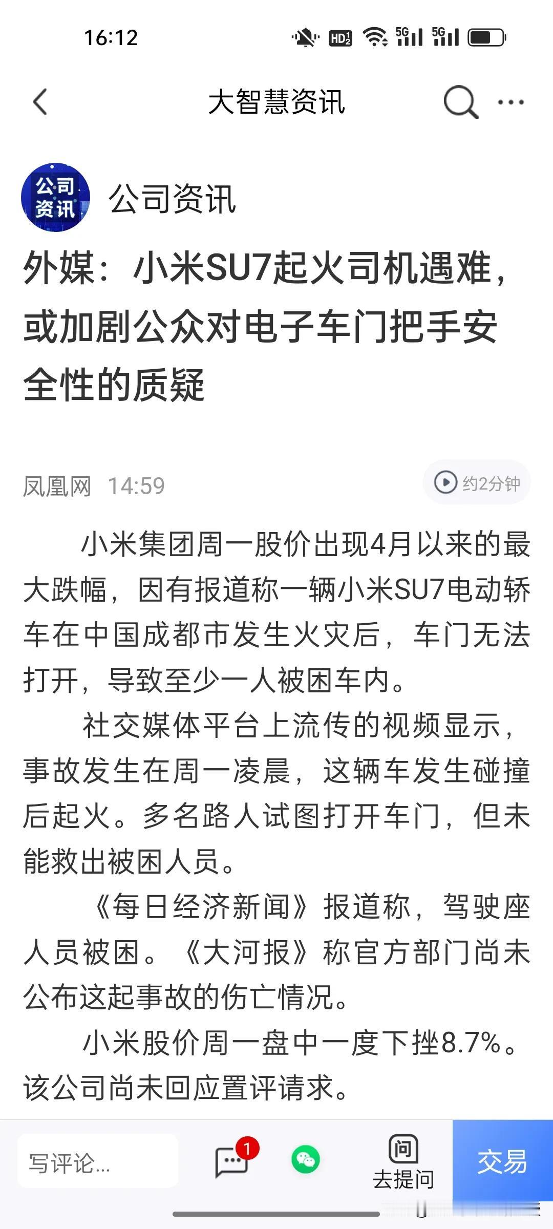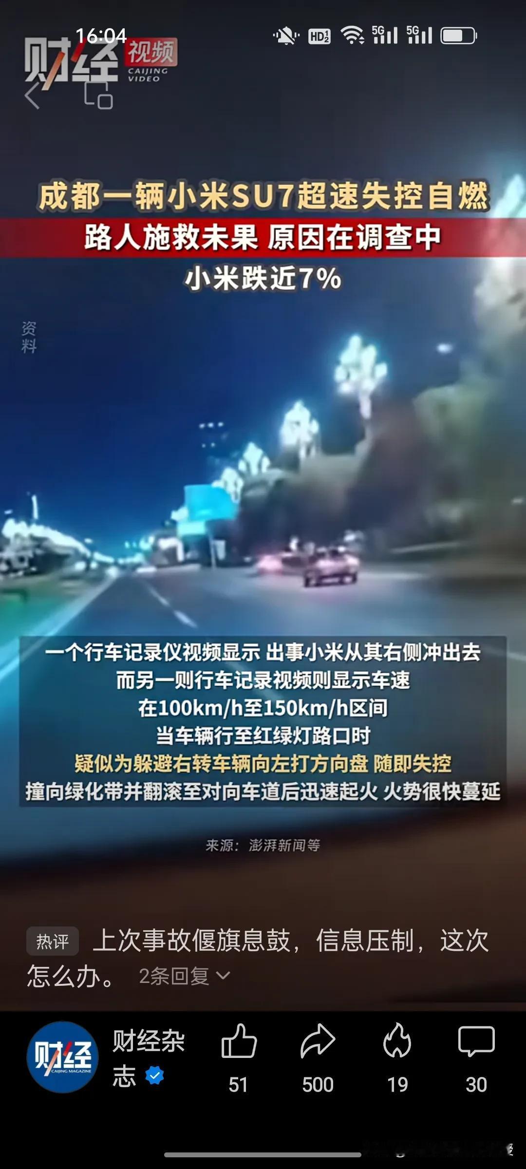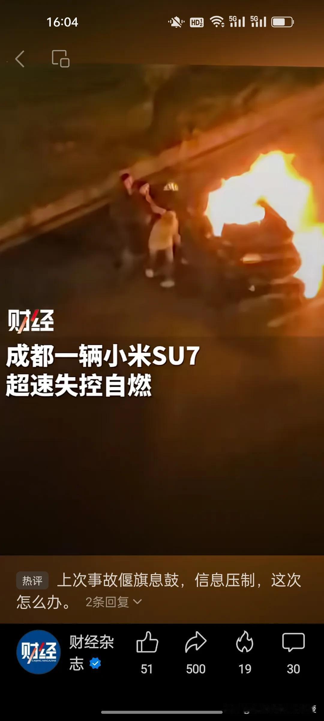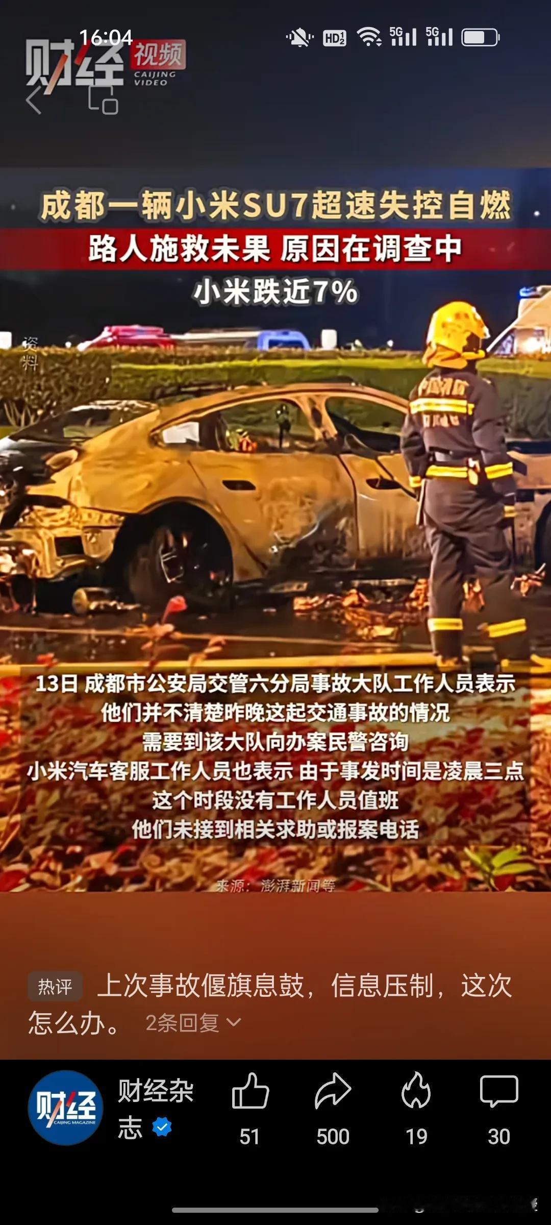 今天凌晨又是一起小米SU7事故。成都一辆小米SU7超速失控自燃,车内驾驶员已经遇难,这是今年看到的第二起令人伤心的事故。 有网友称看到车内驾驶员大叫,随后车辆以极高速度行驶,撞向绿化带后起火,有多位市民帮忙救援,但是车门打不开,砸窗也未能成功。后来消防救援人员用锤子和电锯才打开门。电子车门把手安全性确实是个大问题。关键时刻要是能打开车门,也许就不会发生这起惨剧。小米今天股价也跌了超5%。 小米之前两次召回了SU7刚上市之初的14.7万辆,不知道这次事故车是不是在召回的范围内。 雷军之前说,小米汽车是全网被黑最惨的品牌之一,呼吁全社会打击黑公关。 不过,无论市场争议如何,汽车从诞生那天起,评价一辆车的好坏,安全永远是凌驾于一切性能、设计之上的核心底线,任何时候都容不得半点妥协与侥幸。