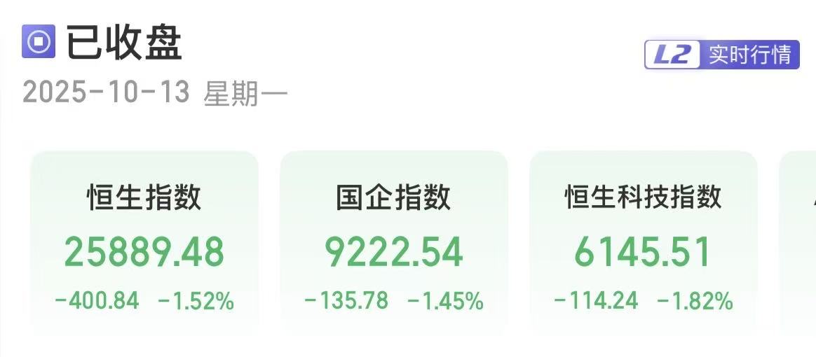 上证报中国证券网讯(刘禹希记者严晓菲)10月13日,港股三大指数集体下挫。截至收盘,恒生指数跌1.52%,报25889.48点;恒生国企指数跌1.45%,报9222.54点;恒生科技指数跌1.82%,报6145.51点。