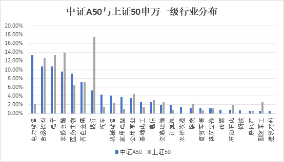 中证A50的创新编制方法不仅让其呈现出相对更优化的行业均衡性,而且按申万一级行业分类,相比上证50指数,新增覆盖农林牧渔、建材、传媒、钢铁行业,超配电力设备及新能源、医药等行业;更重要的是,A50指数的“新经济”(指电力设备、电子、计算机、汽车、通信、医药生物合计)行业占比达42.01%,较上证50的27.44%高出14.57个百分点。